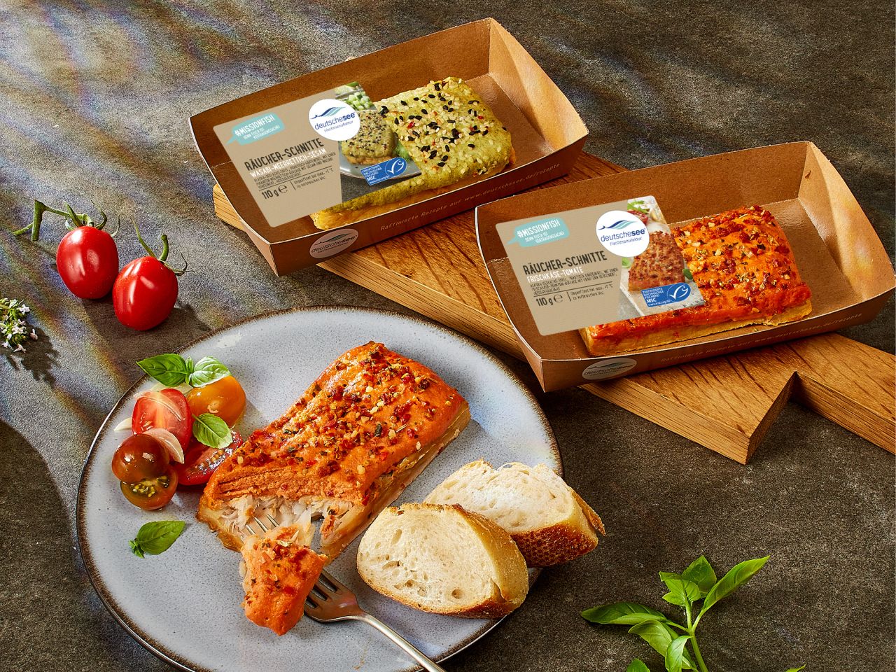 Unsere neuen Räucher-Schnitten sind verzehrfertig und überraschen in zwei raffinierten Varianten: wahlweise mit einer fruchtig-mediterranen Tomaten-Frischkäse-Creme oder mit einer pikanten Komposition aus Wasabi-Meerrettich und Sesam.