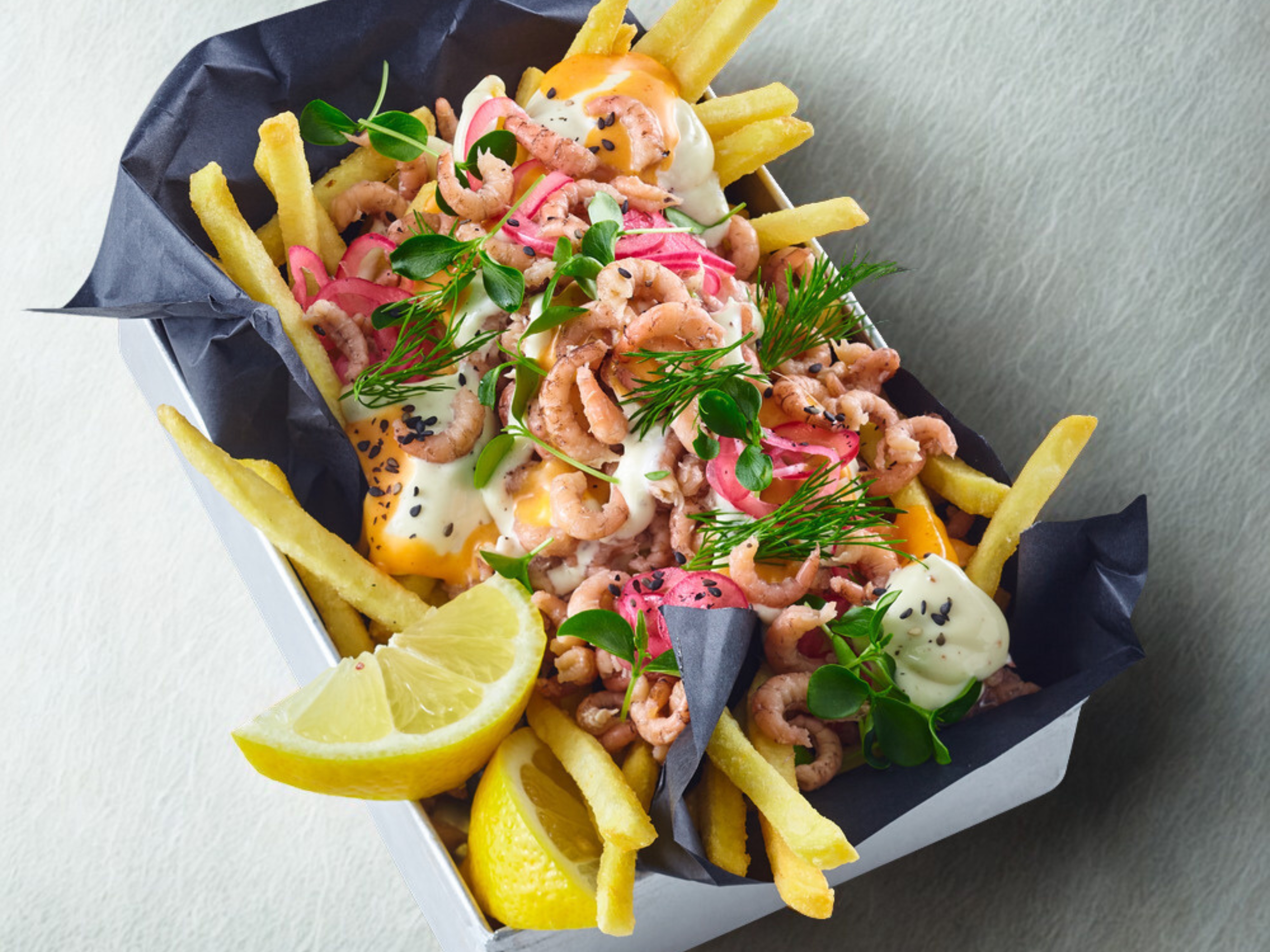 Gefangen im Nordostatlantik (Nordsee), gekocht, ohne Schale, glasiert, tiefgefroren