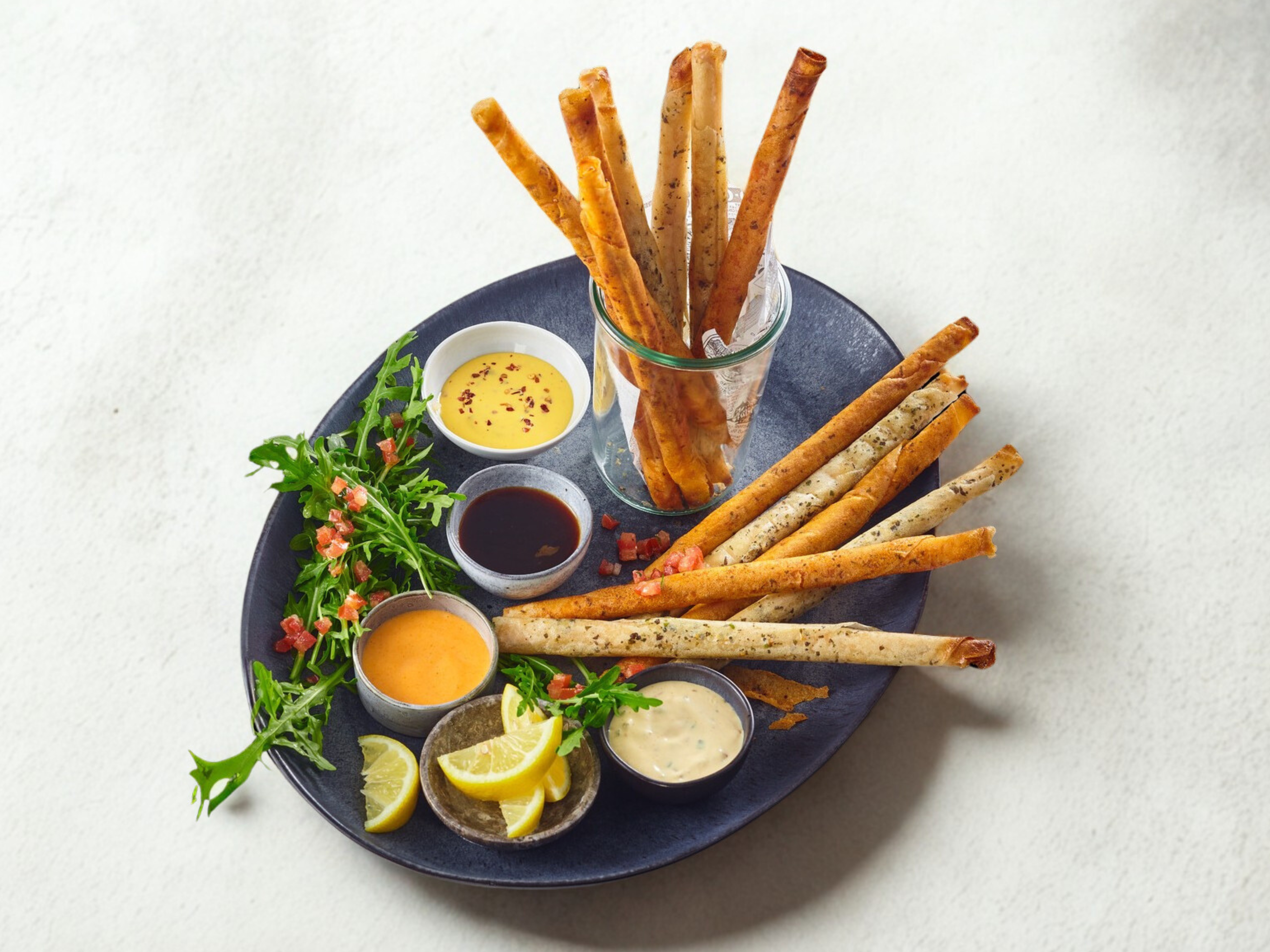 Lachsstäbe, aus in Blöcken tiefgefrorenen Lachsfiletstücken geschnitten, praktisch grätenfrei, mit einer Pesto-Würzmarinade, umhüllt von Brickteig, einzeln entnehmbar, tiefgefroren