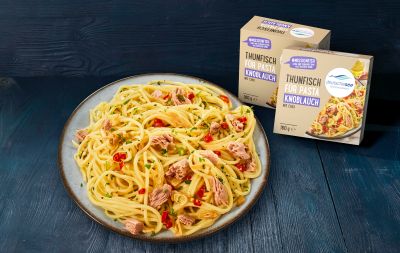 Der Thunfisch für Pasta „Tomate“, eine Komposition aus cremig-fruchtiger Tomatensauce mit Thunfisch, überzeugt durch hochwertige Klarheit. Mit ein wenig Parmesan oder Oliven bekommt das Ganze ruckzuck eine persönliche Note. Beim Thunfisch für Pasta „Knoblauch“ werden gedünstete Thunfischfilets in mundgerechte Stücke geschnitten und mit Sonnenblumenöl, Knoblauch, Chili und Salz verfeinert.