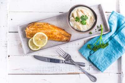 Muscheln gründlich mit kaltem Wasser spülen. Die Meerbarbe schuppen, filieren, die Stehgräten ziehen und die Filets in grobe Würfel schneiden. Muscheln und Meerbarbe kaltstellen.