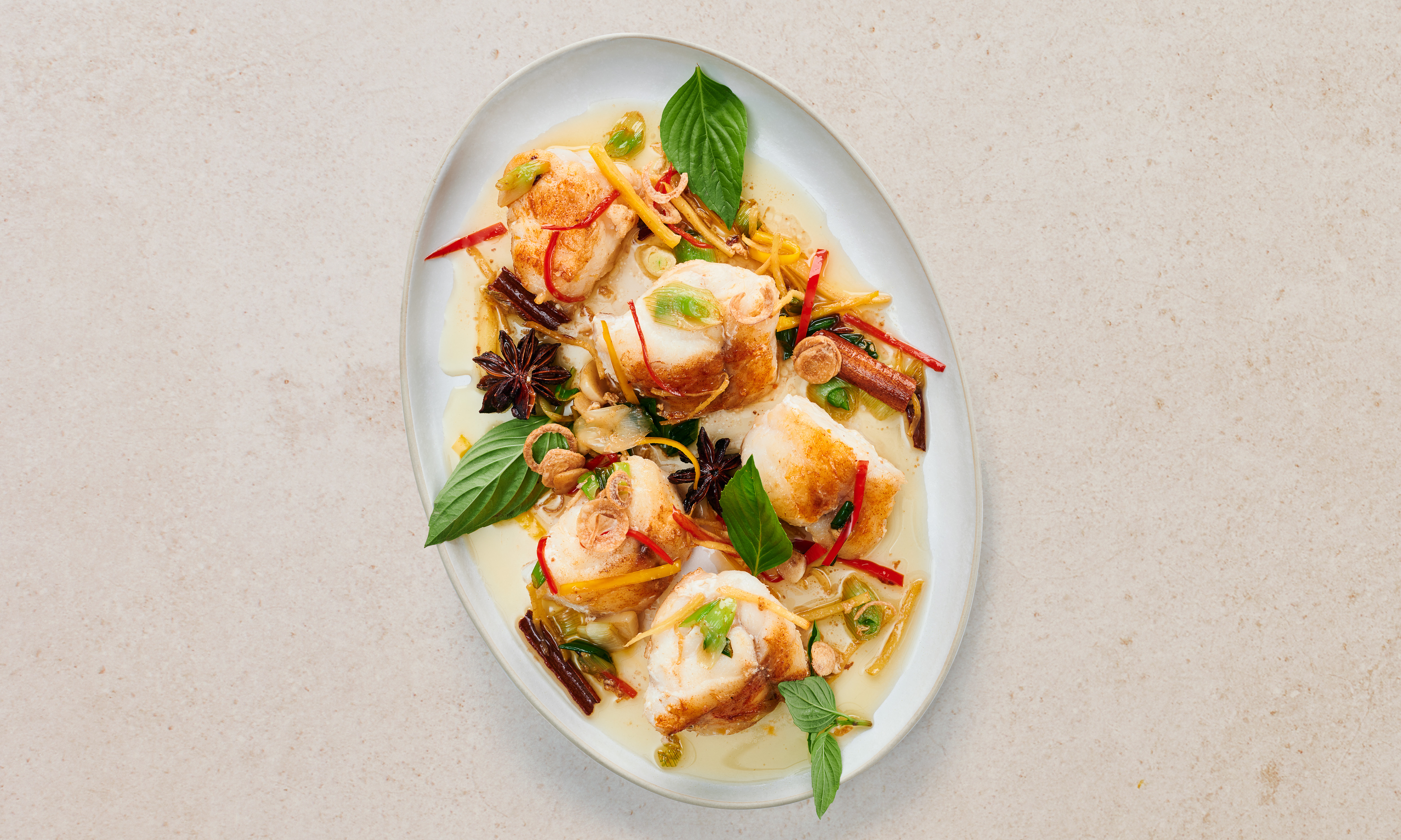 Der feine Seeteufel findet in diesem leichten Rezept frische Begleiter aus der asiatischen Küche. Ingwer, Peperoni und Thai-Basilikum geben ihm eine pikante Note, Zimt, Ahornsirup und Sesamöl runden das Gericht ab.