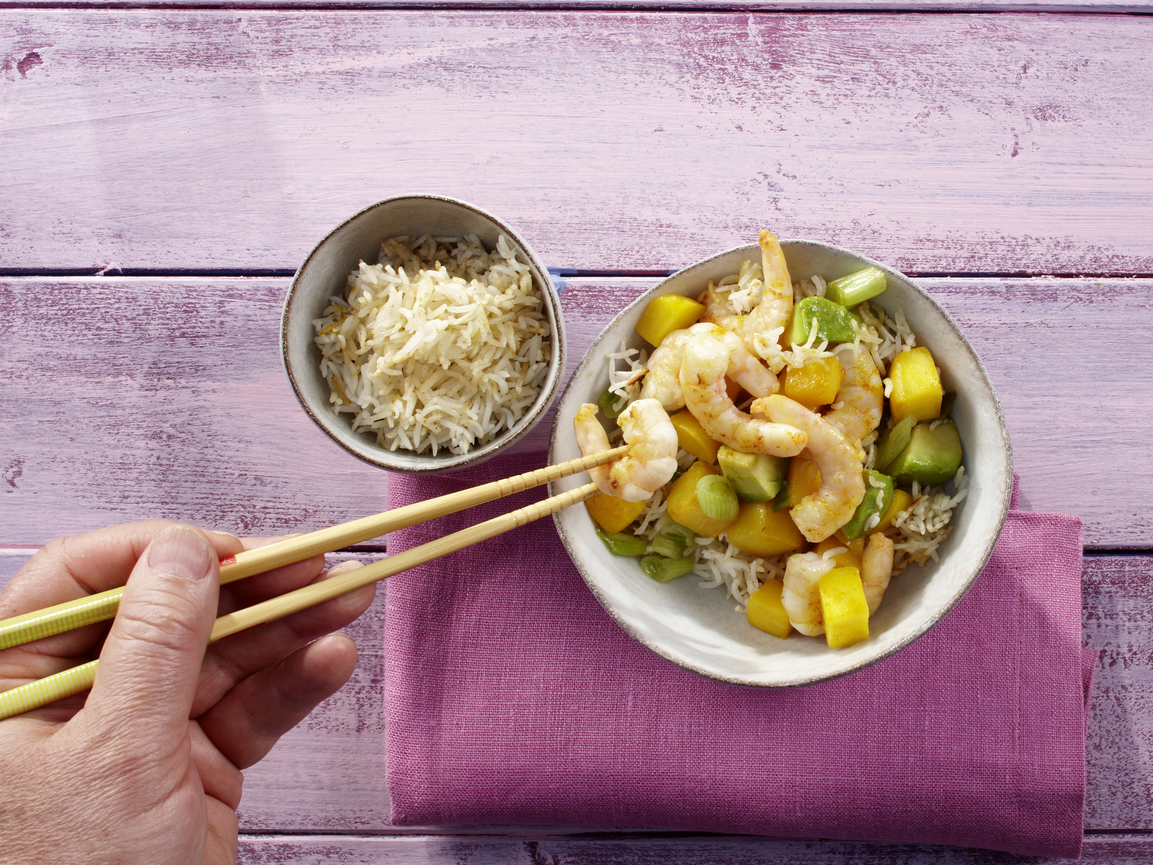 Das restliche Öl in der Pfanne erhitzen. Gekochten Reis, Chili und die Hälfte der Frühlingszwiebeln 4 Minuten darin braten. Die Garnelen und die Mangowürfel untermischen und 1 weitere Minute braten. Dann erst die Avocadowürfel vorsichtig unterheben und erwärmen. Die Reispfanne mit Salz und Pfeffer würzen und mit den übrigen Frühlingszwiebeln bestreut servieren.
