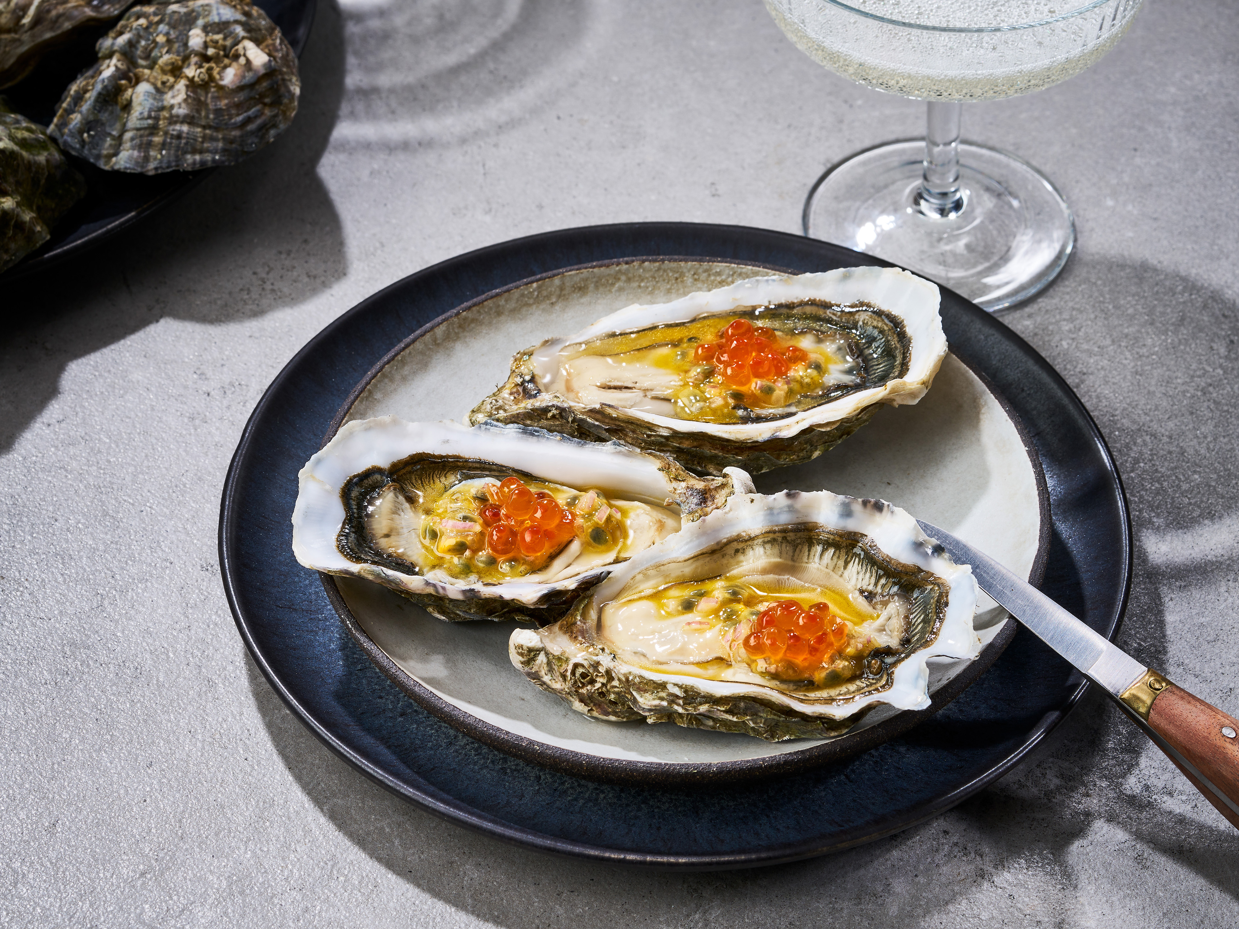 Austernfleisch in der Schale mit der Passionsfruchtmarinade beträufeln und den Kaviar darüber verteilen.