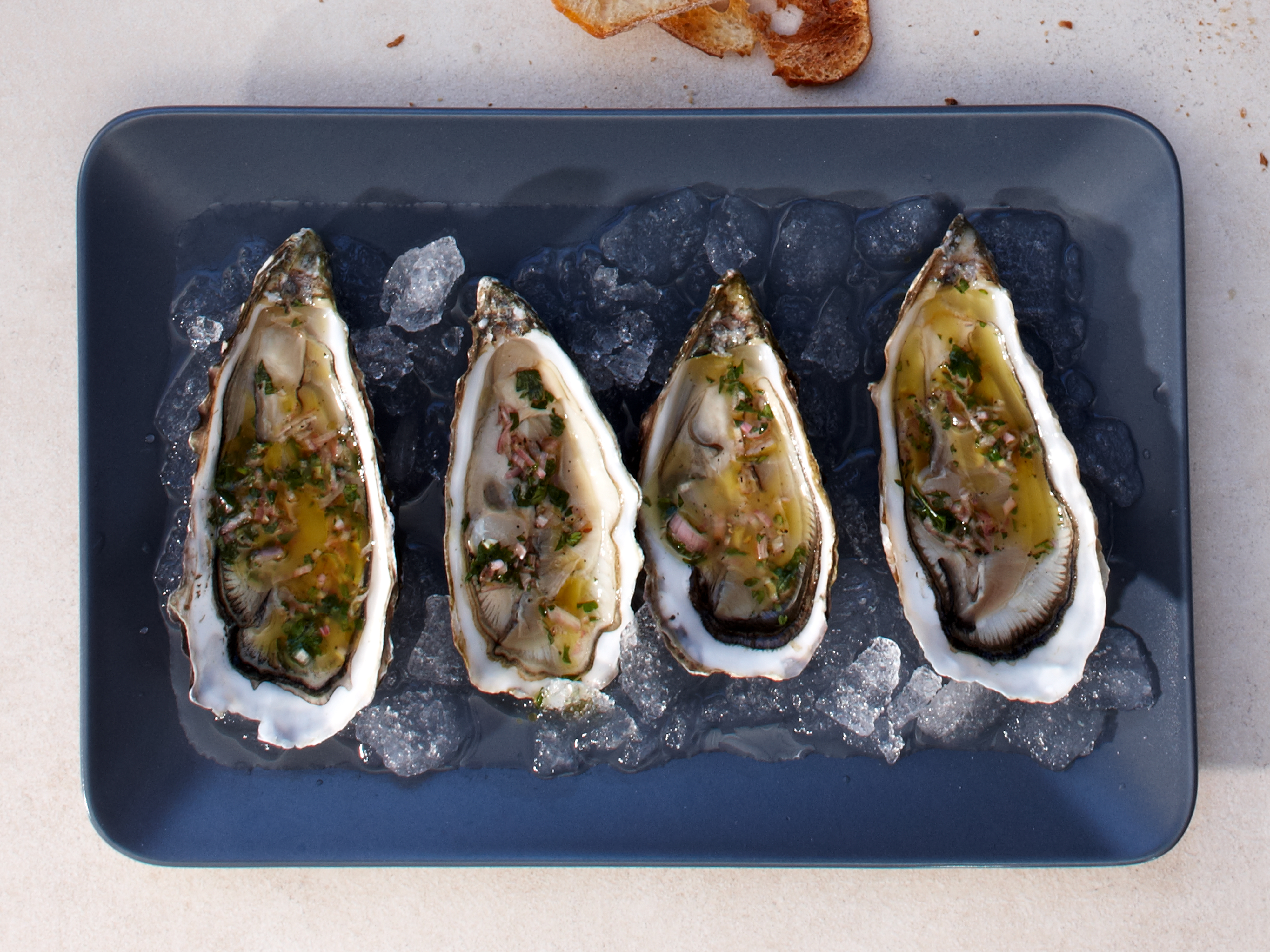 So schlicht und dennoch ein Klassiker der Gourmetküche. Frische Austern in einem leichten Essig-Öl-Dressing mit Schalotten und Kerbel.