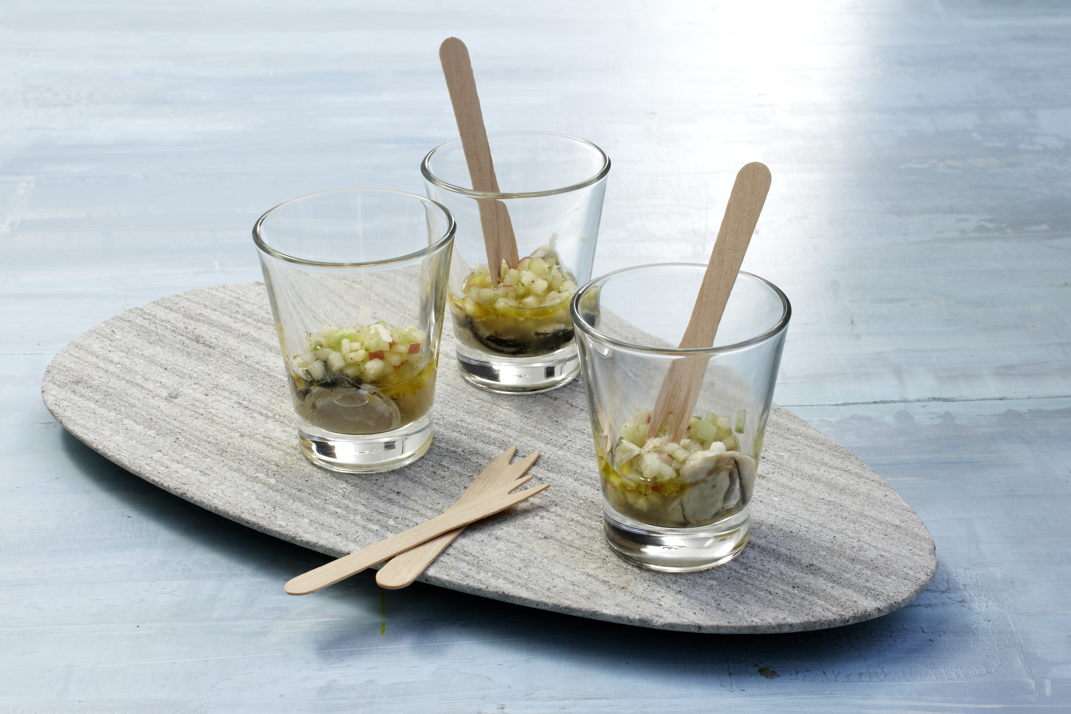Die rohe Auster, direkt aus der Schale wird hier eine Tour weitergedreht und mit einer säuerlich-frischen Vinaigrette im Glas serviert.