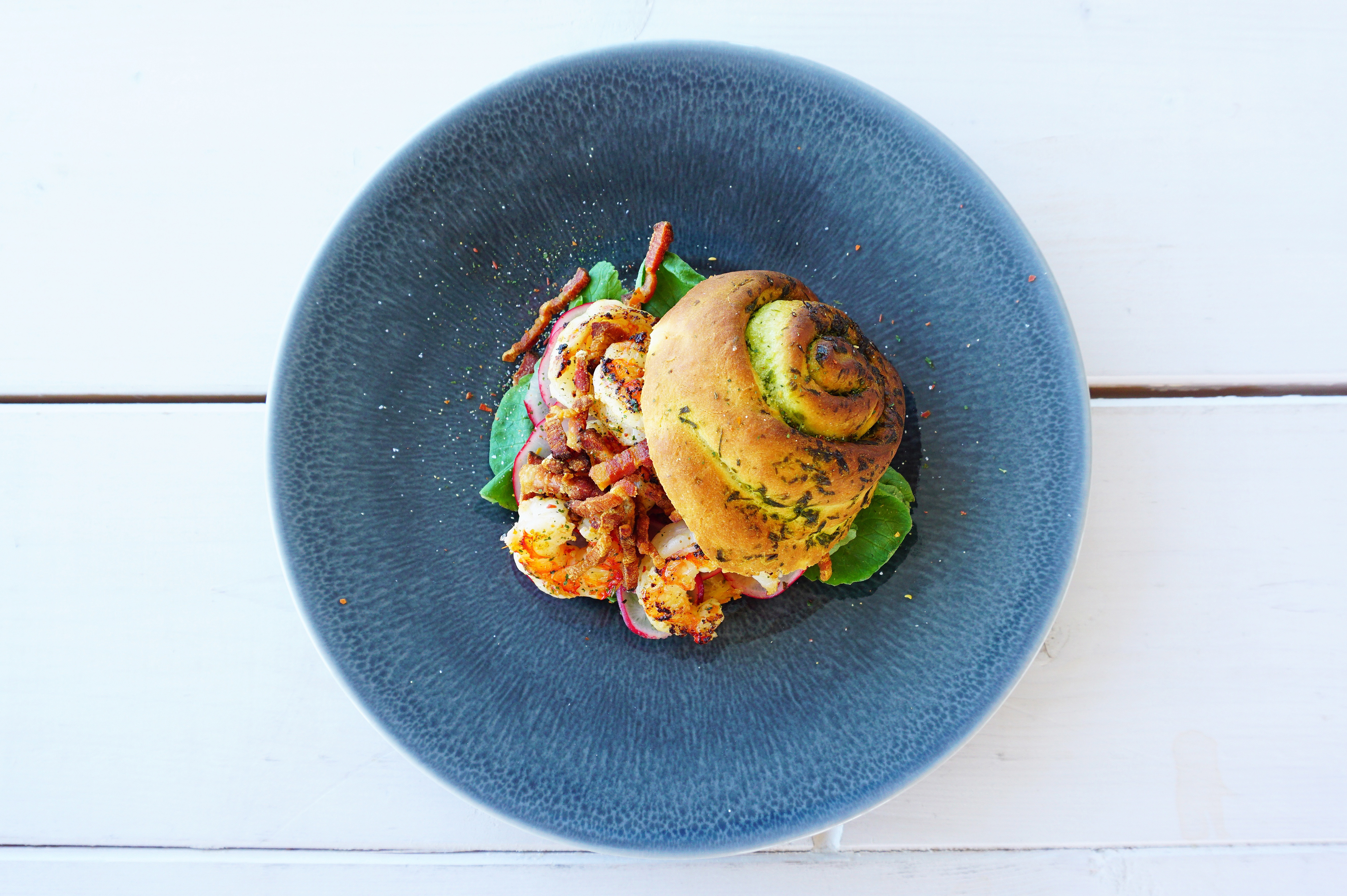 Aus Focacciateig zaubern wir eine saftige Bärlauchschnecke und belegen sie mit Argentinischen Rotgarnelen, Radieschen und würziger Aioli.
