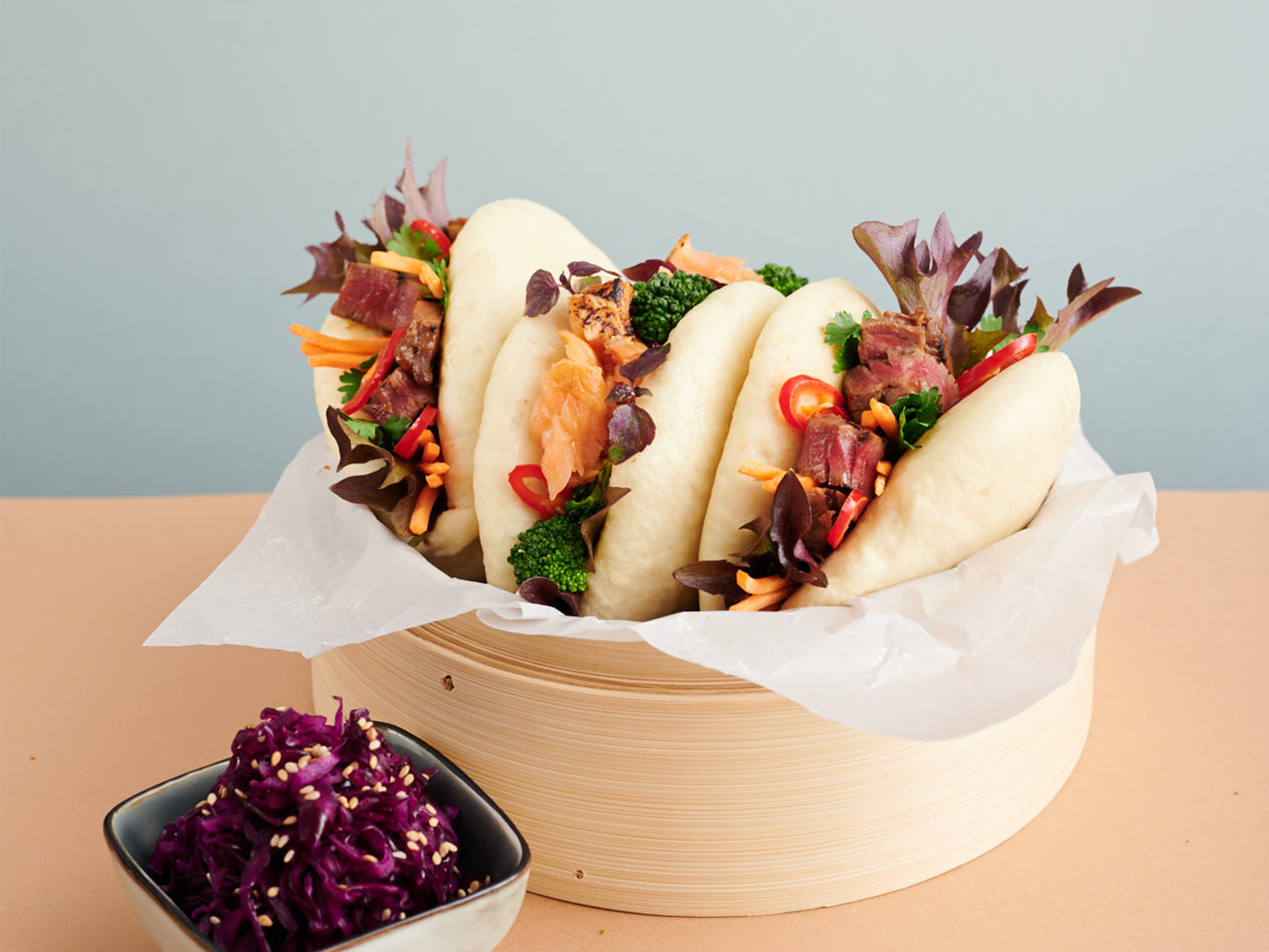 Rinder- und Lachsfilet in feine Tranchen schneiden. Die Bao Buns leicht aufdrücken, mit den Lieblingszutaten füllen und am besten noch warm servieren.
