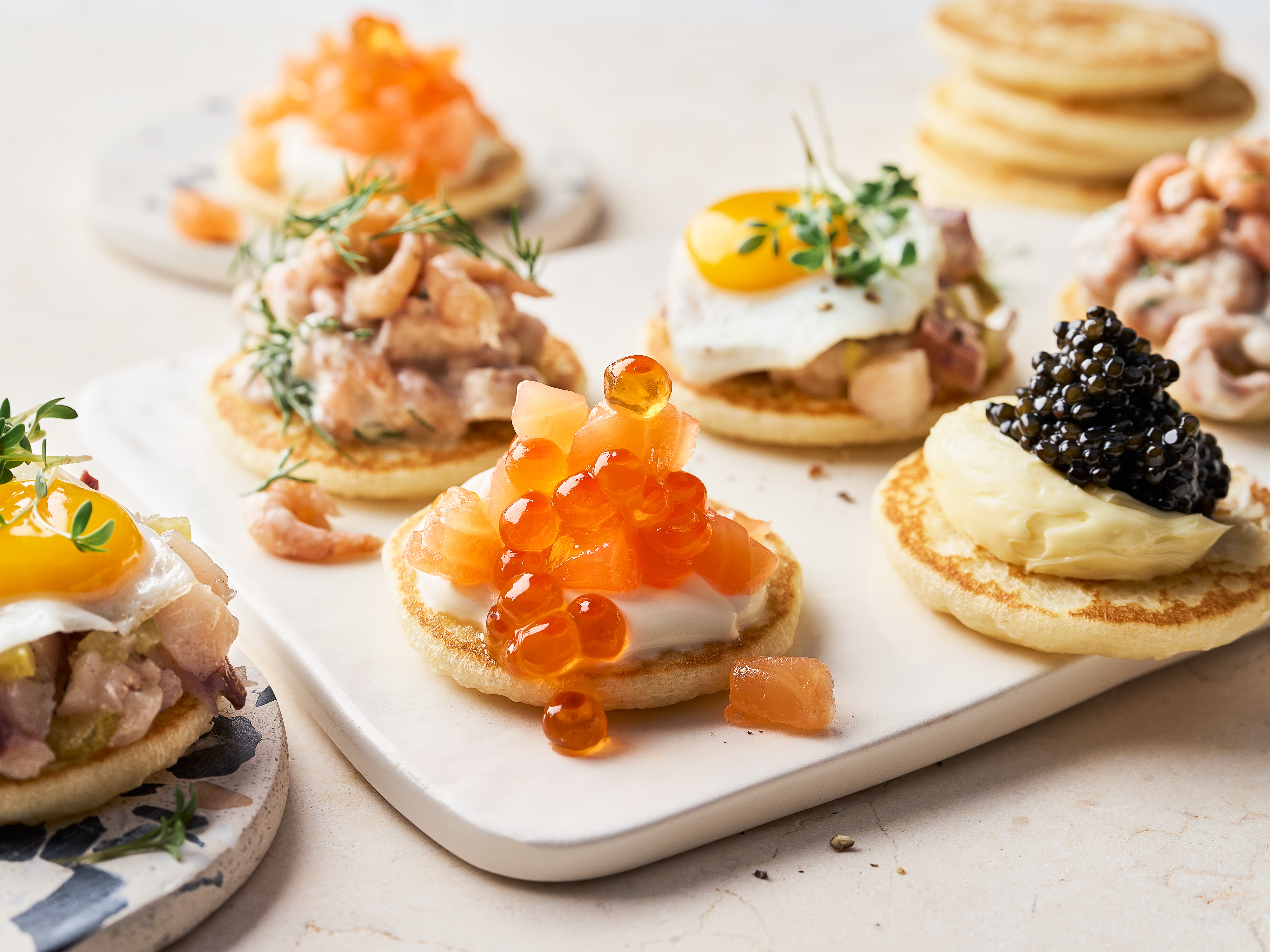 Blini-Variationen mit Kaviar, Krabben, Lachs und Matjes