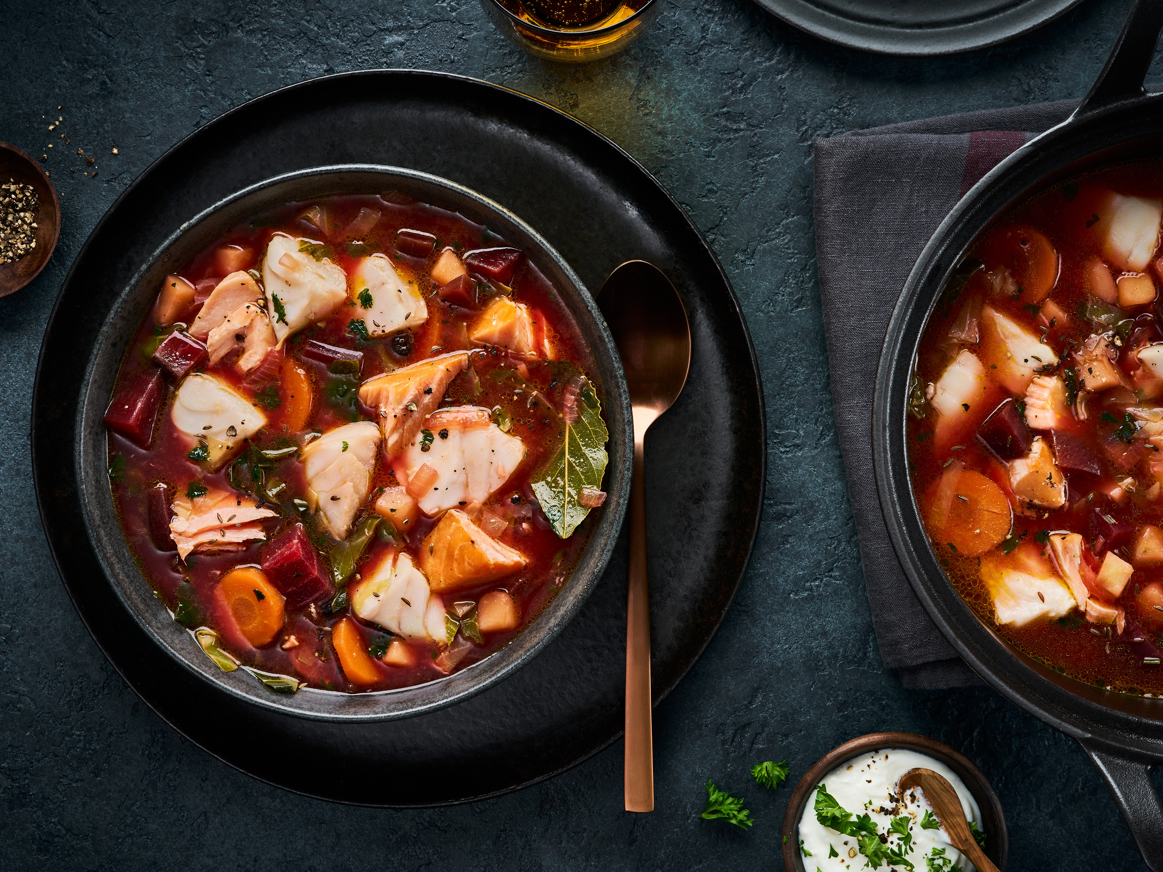 - 5 Kabeljau, Stremellachs und Petersilie in die heiße Suppe geben und alles noch etwa 3-4 Minuten gar ziehen lassen. Suppe anrichten und mit einem Klecks saurer Sahne servieren.