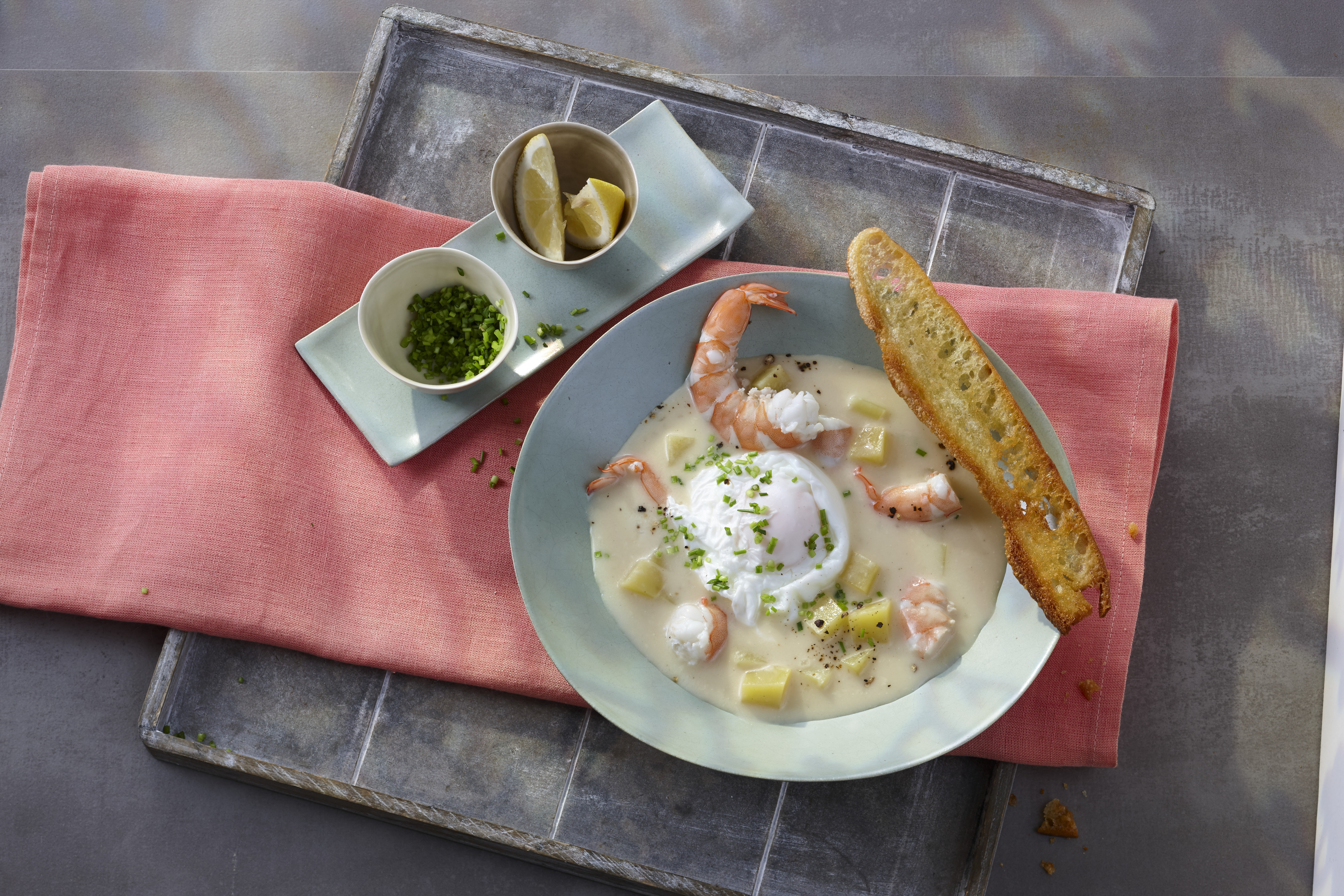 Dank der feinen Garnelen entfalten sich die Aromen dieser herrlich cremigen Fischsuppe fast von selbst - ein feines Süppchen für den Gaumen.