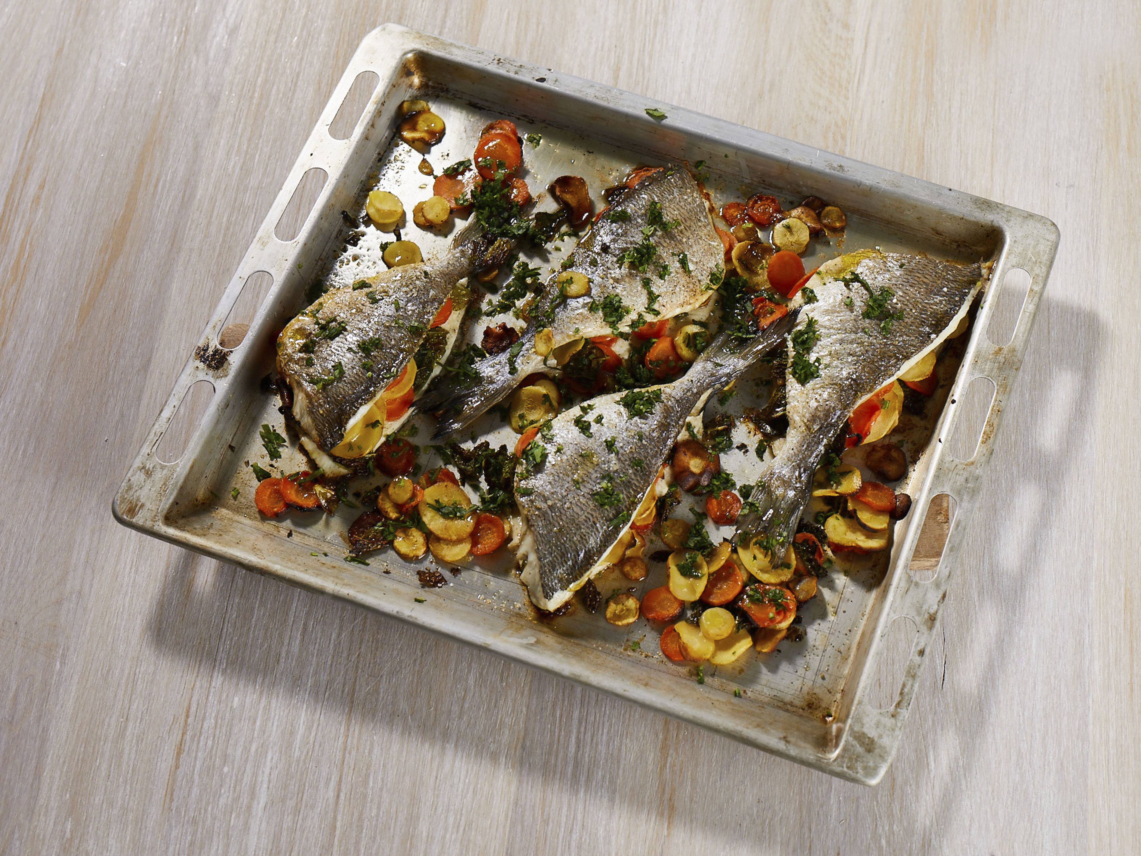 Ab in den Ofen: Die Doraden werden mit Möhren, Pastinaken und Wirsing gefüllt und garen im Ofen ganz allein vor sich hin – einfacher geht’s nicht.
