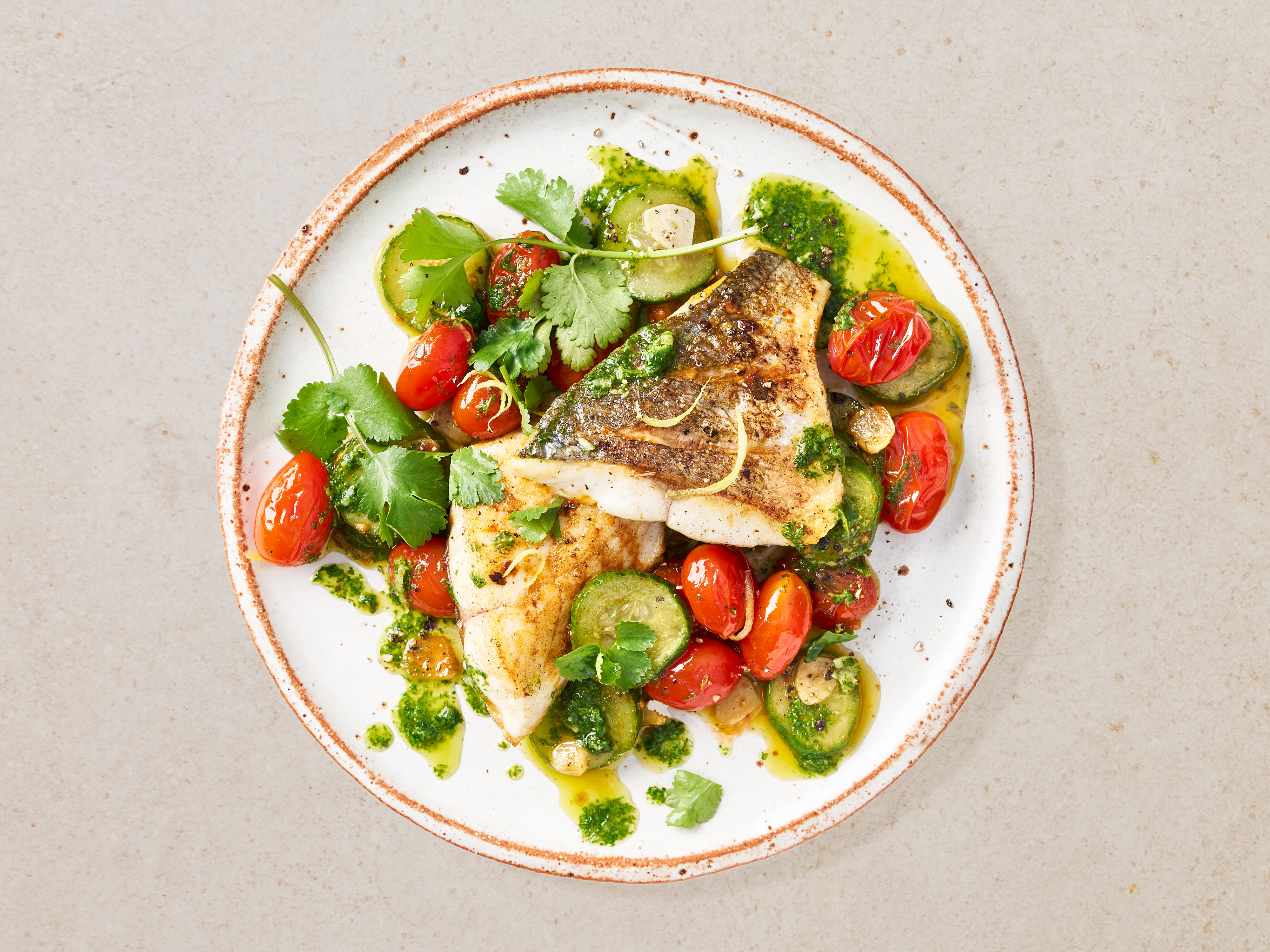 Wir gehen in die Geschmacksoffensive! Die feurig-scharfen Doradenfilets mit selbstgemachtem Korianderpesto liegen auf einem Bett aus Tomaten und Gurken, die im Sommer so herrlich aromatisch schmecken.