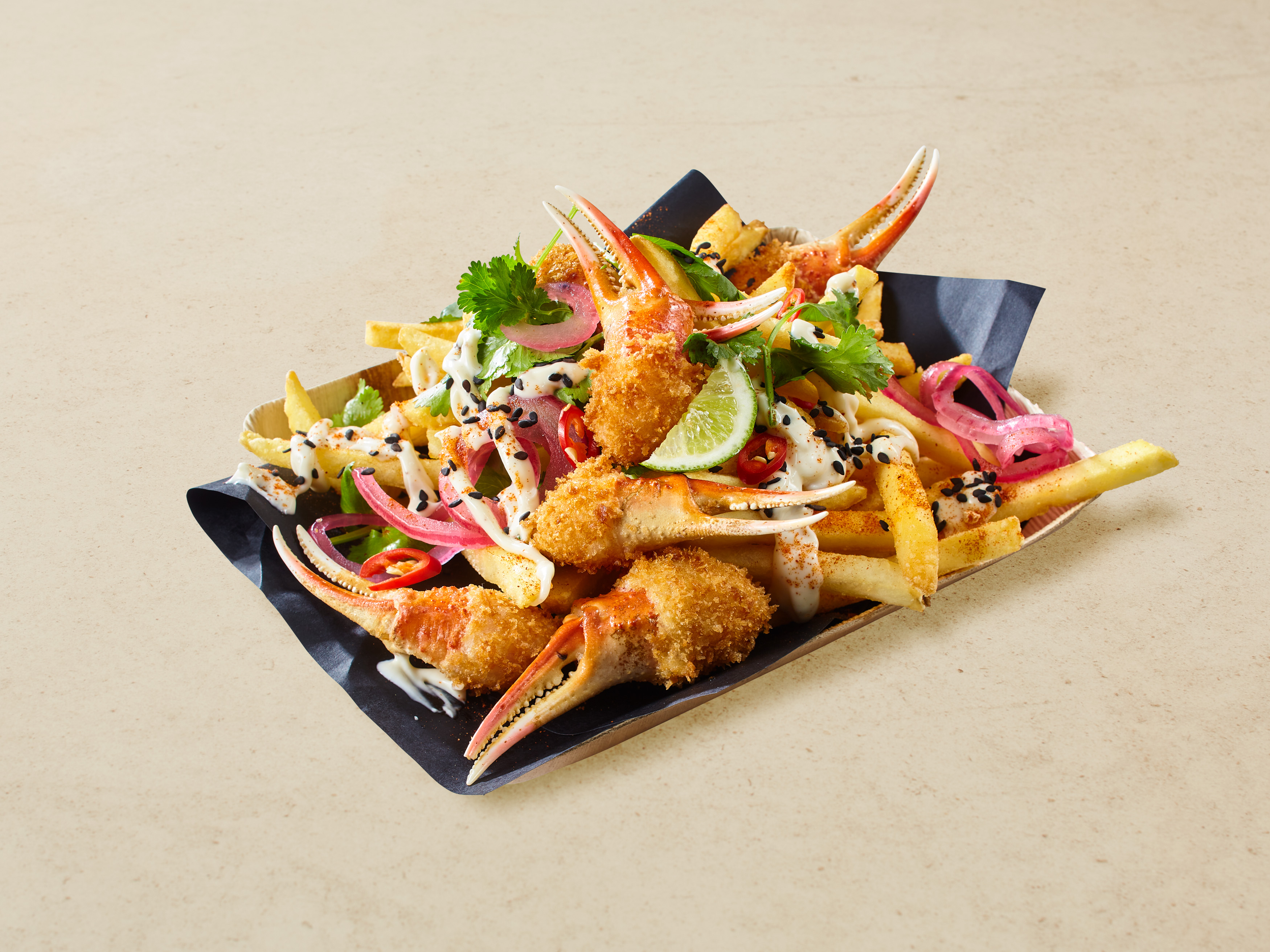 - 4 Pommes nach Packungsanweisung in Pflanzenfett ausbacken, mit dem Pommesgewürz vermengen und auf einen Teller geben. Die fertigen Schneekrabbenscheren darüber verteilen. Die eingelegten Zwiebeln auf einem Sieb abtropfen lassen und ebenfalls über die Pommes geben. Mit Trüffelmayonnaise, Koriander, kleingeschnittenen Chiliringen, schwarzem Sesam, Limettenzesten- und Scheiben garnieren.