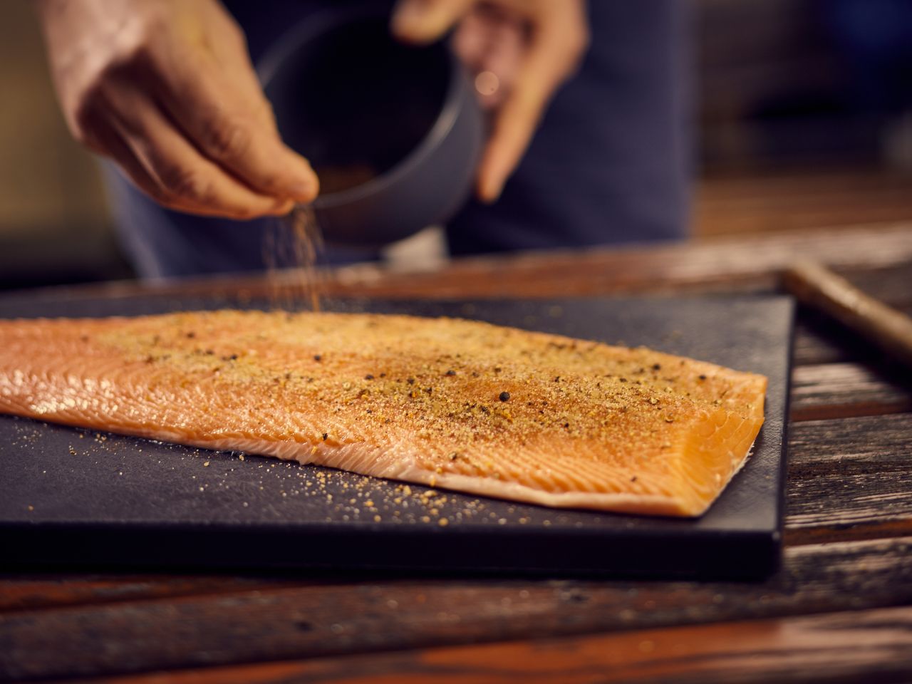 - Bevor der Lachs ans Feuer kommt, sollte er kräftig gewürzt werden und dann mindestens 30 Minuten ruhen. Puristen bestreuen ihn nur mit grobem Salz, wer Abwechslung liebt kann zusätzlich Gewürze wie gemahlenen Fenchel, Koriander oder das BBQ-Gewürz aus unserem Online-Shop über die rohe Lachsseite streuen.