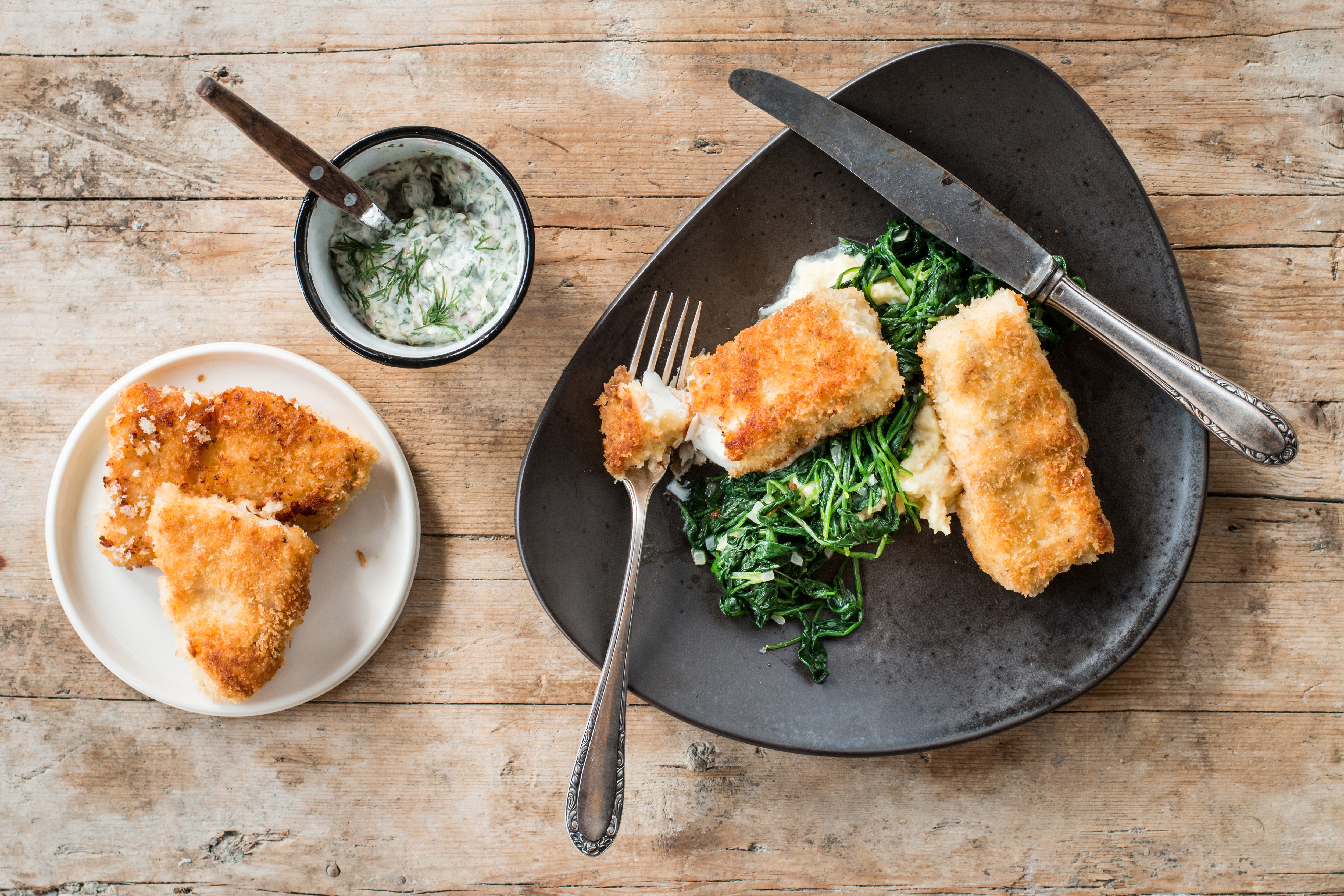 Kabeljau waschen, trocken tupfen und in ca. 4 cm breite Streifen schneiden. Mit Salz und Pfeffer würzen. Eier auf einem Teller verquirlen. Eine Panierstraße mit Mehl, Eiern und Panko vorbereiten. Die kleinen Kabeljaufilets in Mehl, dann in Ei und zuletzt in Panko wenden.