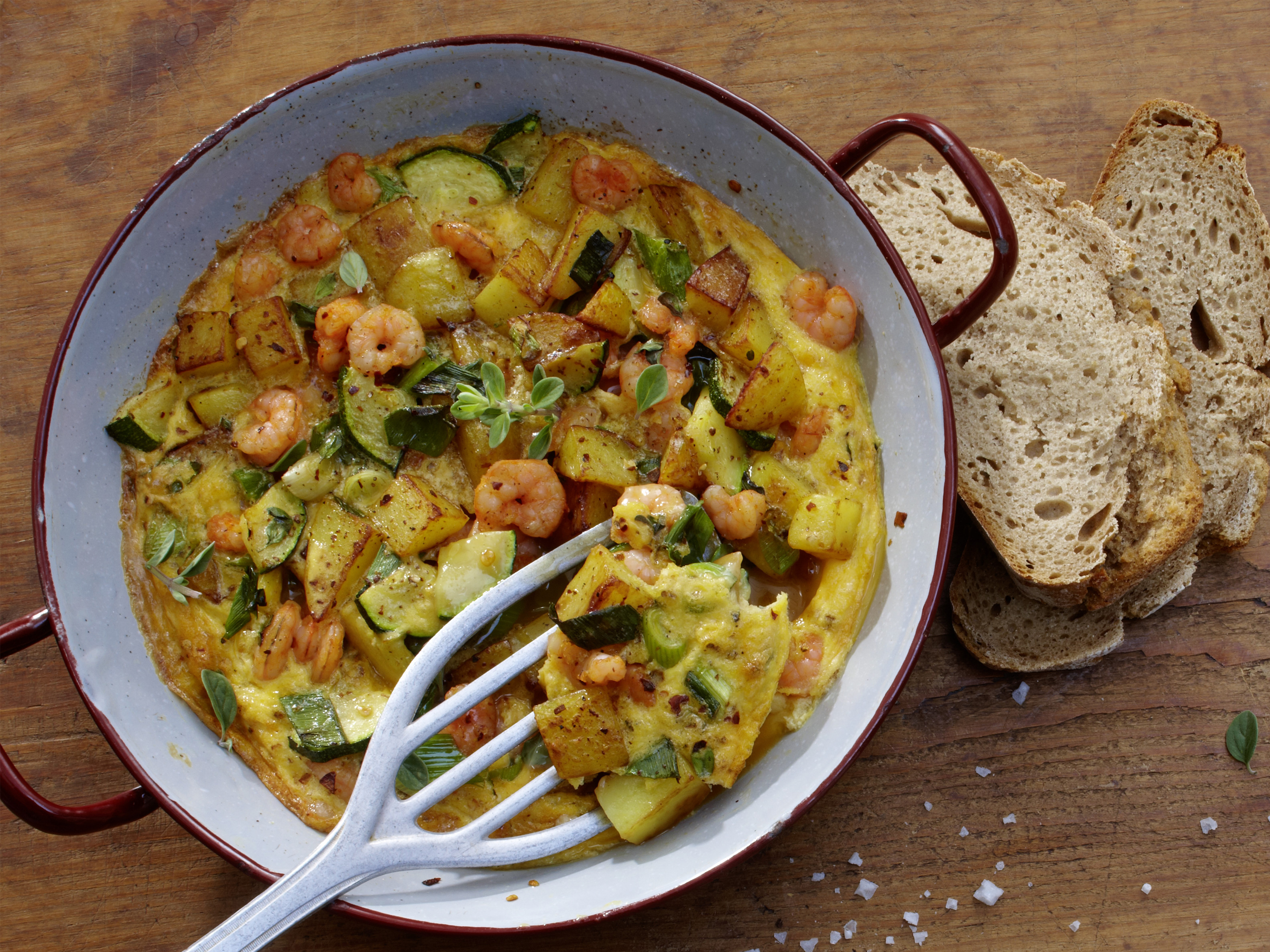 Frittata ist die italienische Version des Bauernfrühstücks. Mit in der Pfanne sind Zucchini und Oregano sowie Cocktailgarnelen als kleiner Gruß des Nordens!