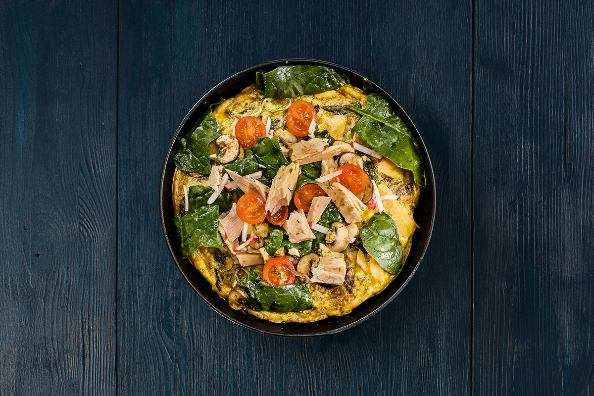 Italienisches Omelette mit Thunfisch: Champignons, Lauch, Spargel, Schinken, Tomaten, Eier und Thunfisch werden in der Pfanne im Handumdrehen zu einer saftigen Frittata.