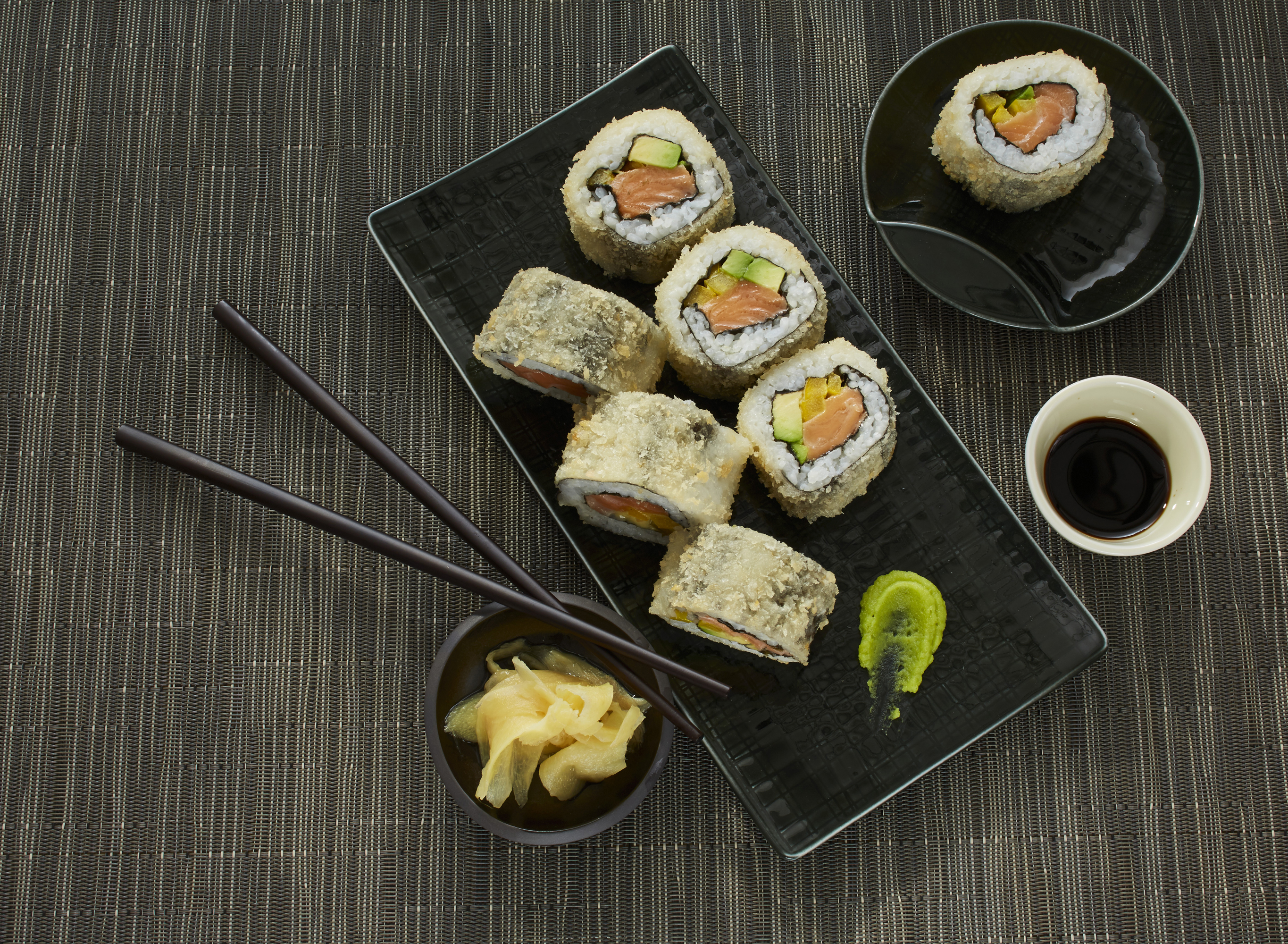 Außen knusprig, innen saftig: frittiertes Sushi Ura-Maki. Die Inside-out-Rolls sind mit Lachs, Avocado und Paprika befüllt und im Tempurateig gebacken.