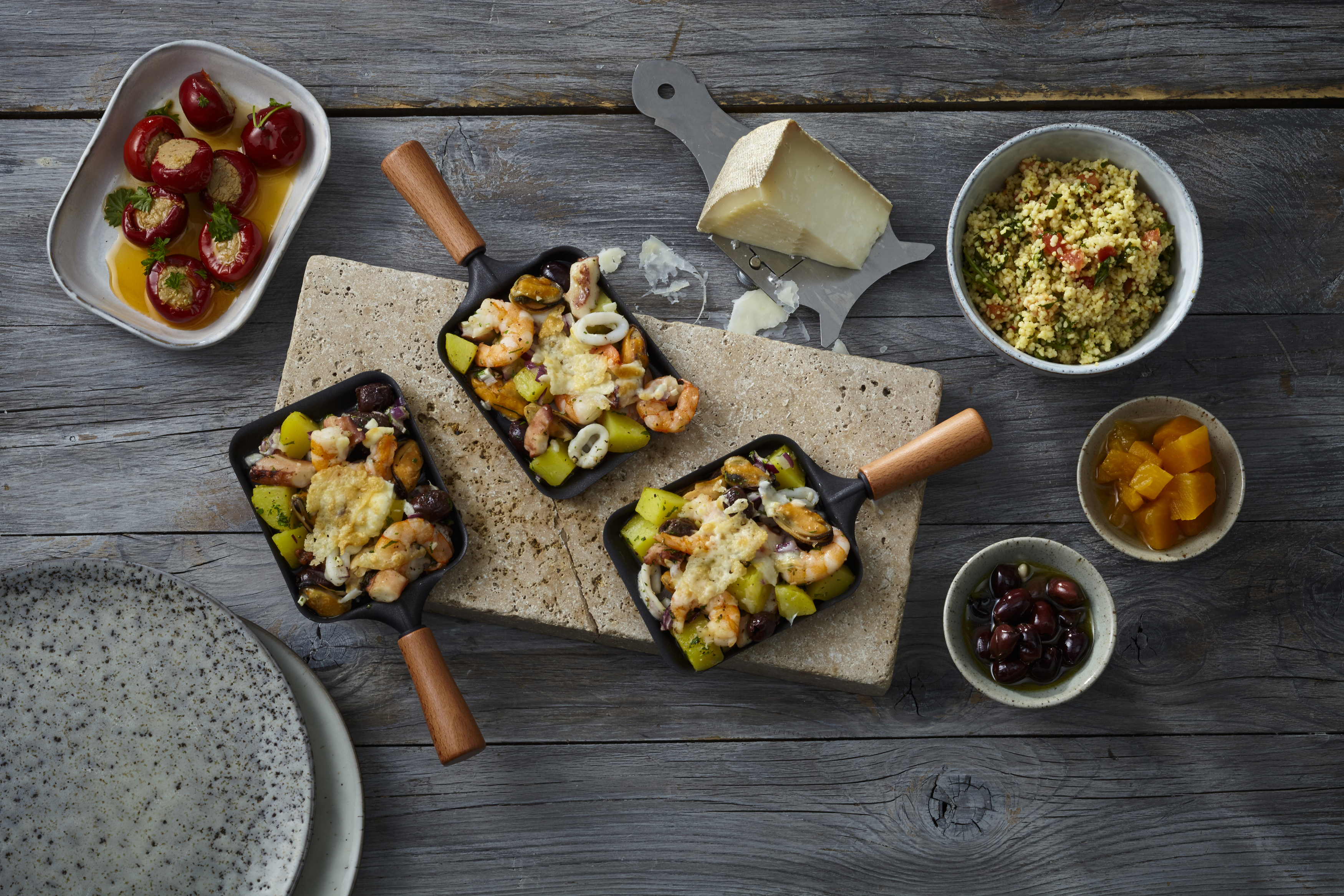 Alle Zutaten, bis auf Pecorino, mit Oliven und Olivenöl vermischen und mit Salz und Pfeffer würzen. Alles auf die Pfännchen verteilen und mit dem Pecorino bestreuen. Im Raclette zur gewünschten Bräunung bringen.
