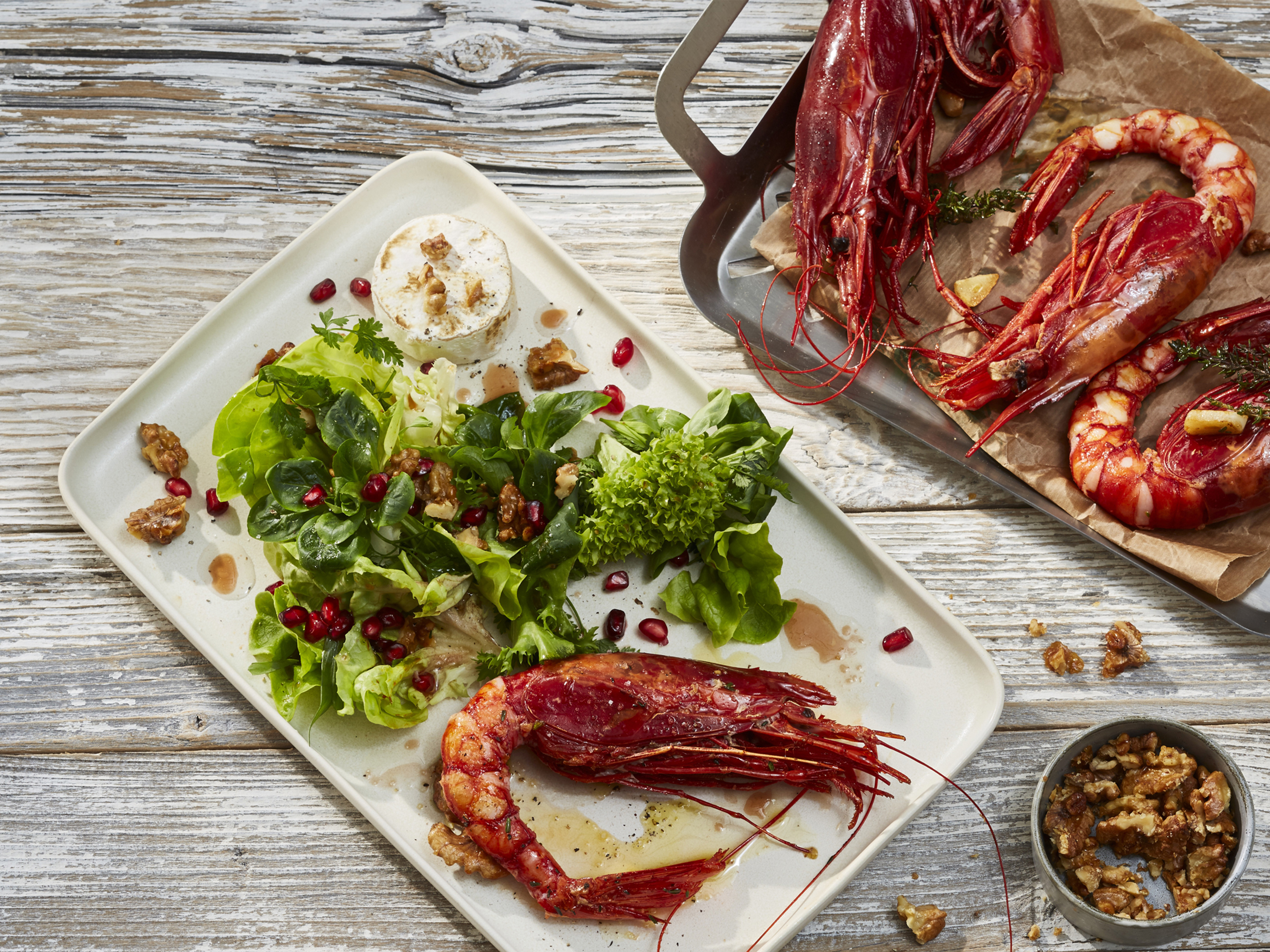Währenddessen Ziegenkäse im Ofen unter der Oberhitze goldgelb gratinieren. Salat mit den Granatapfelkernen anrichten. Gratinierten Ziegenkäse auf den Salat setzen und mit Salznüssen bestreuen. Die Gambas Carabiniera dazu reichen.
