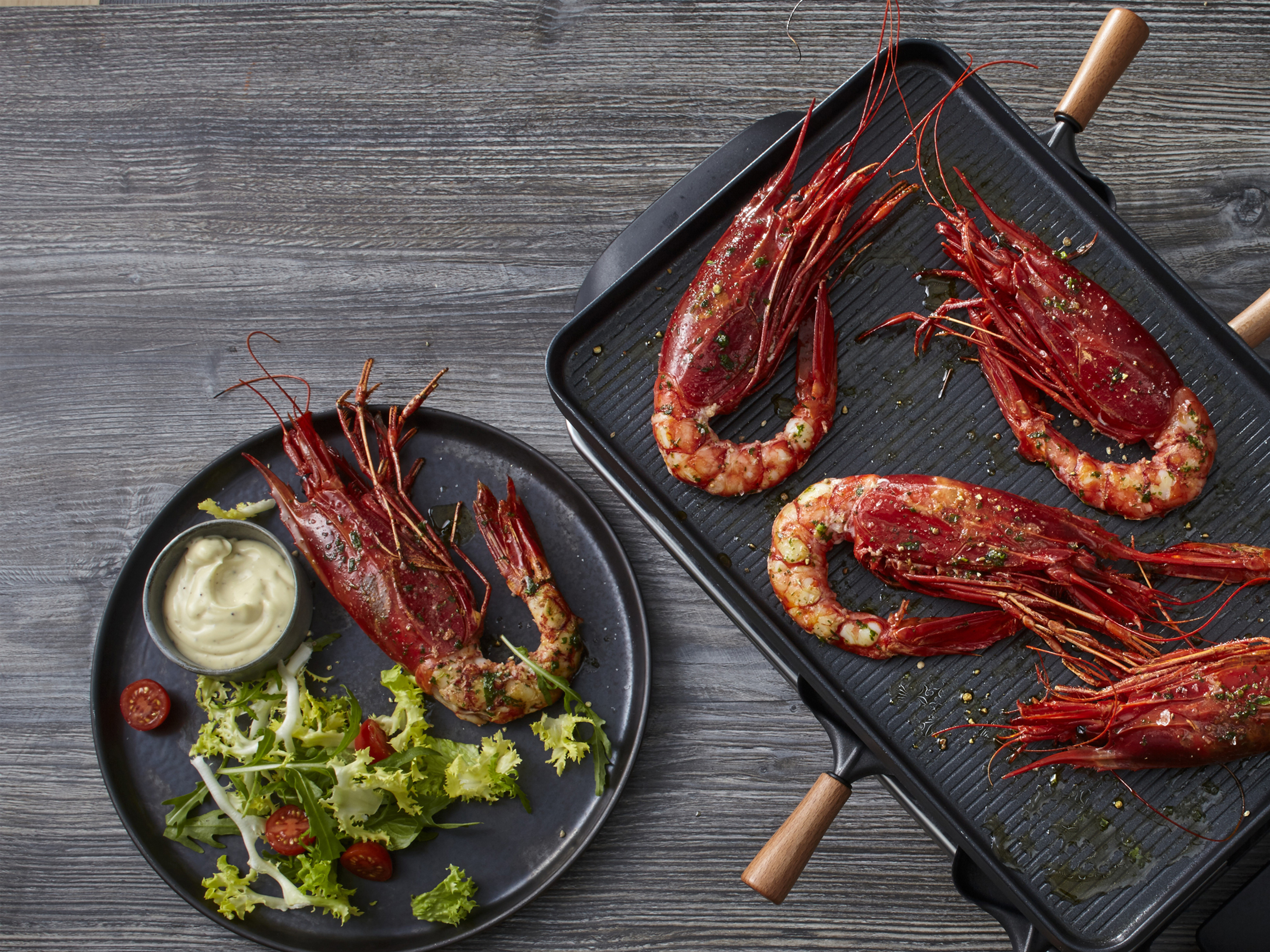 Olivenöl auf die Grillplatte des Raclettes geben und die Gambas für etwa 4 Minuten je Seite grillen. Dazu Trüffel Aioli anbieten.