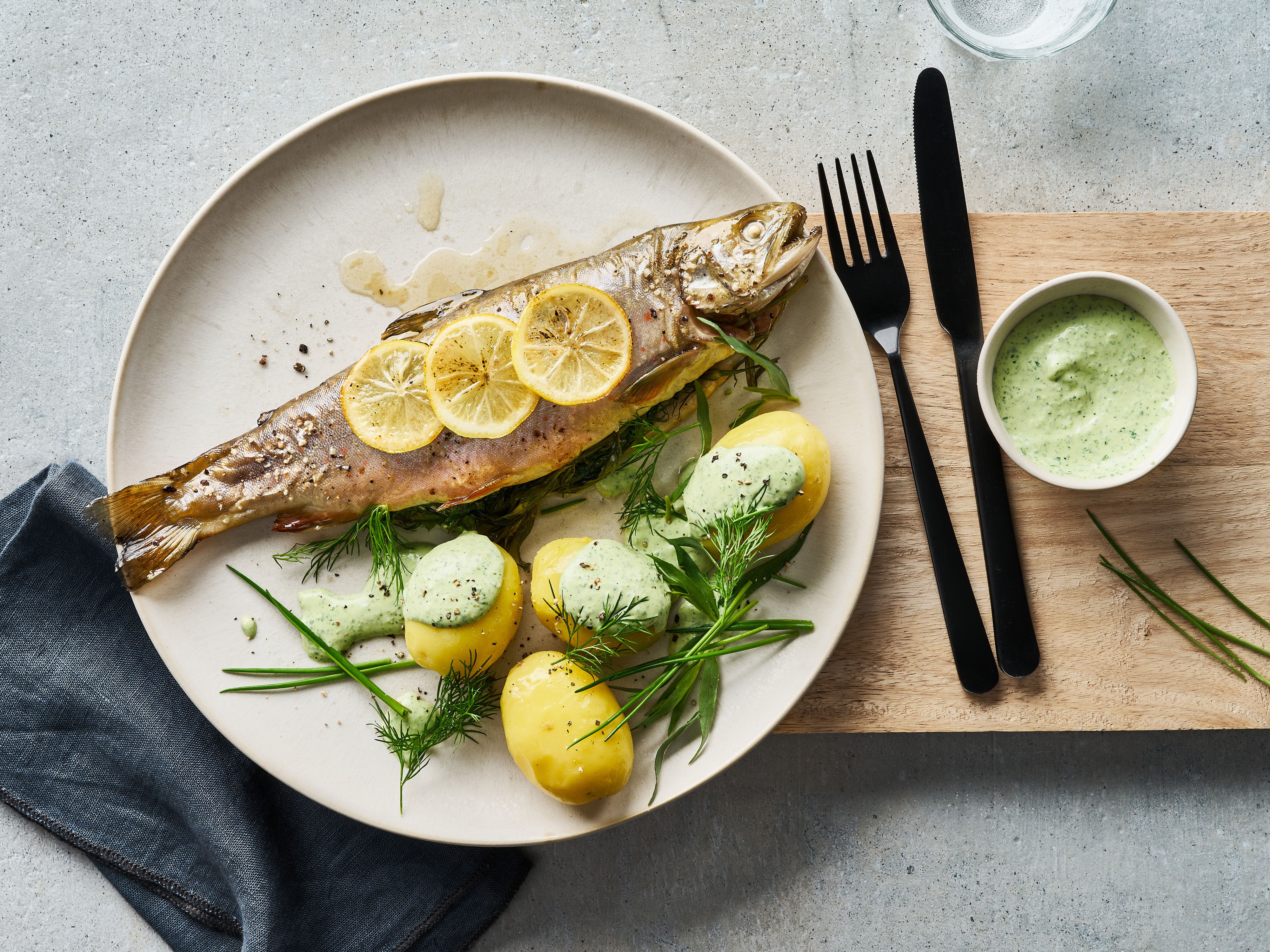 - 1 Kartoffeln mit Schale im Salzwasser garen. Ofen auf 180°C vorheizen. Saiblinge kalt abspülen und gründlich trocken tupfen. Kiemen mit einer Küchenschere oder einem Messer herausschneiden. Saiblinge von innen und außen mit Salz und Pfeffer würzen und mit der Hälfte der Kräuter füllen.