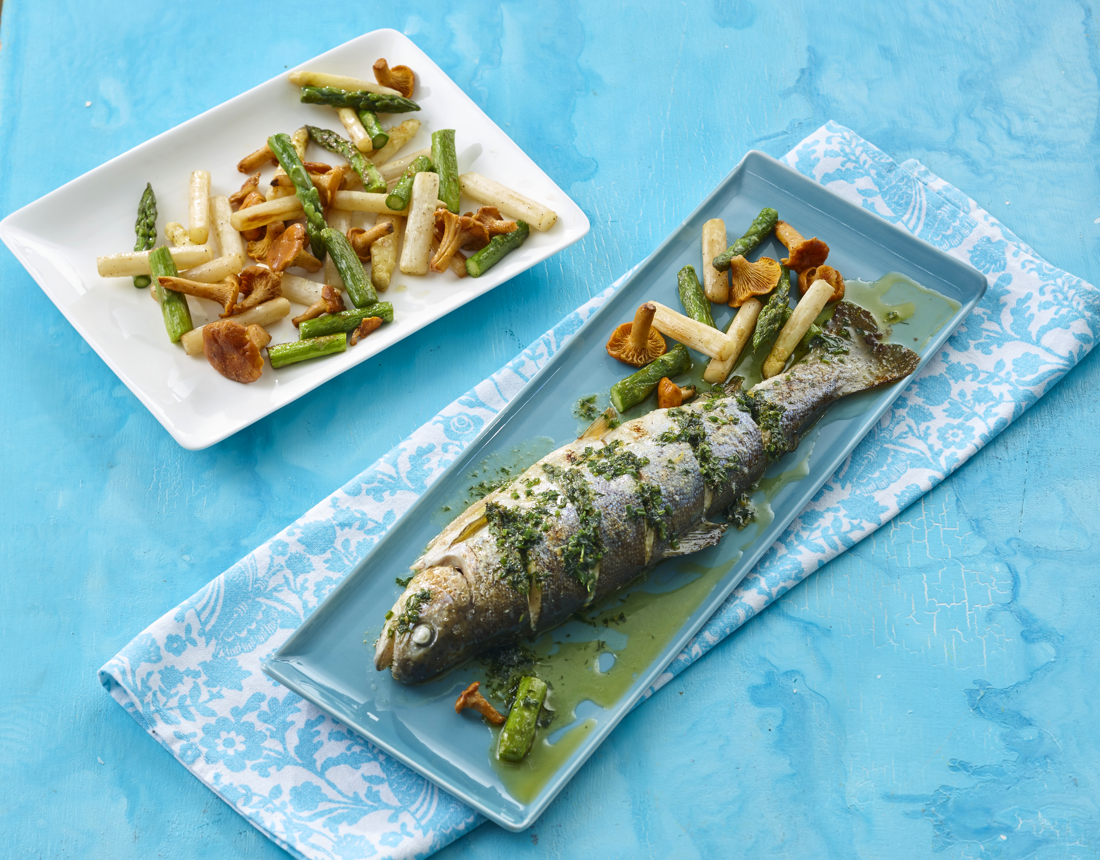 Der Saibling erhält durch die Zitronen-Kräuterbutter ein herrlich frisches Aroma. Zum perfekten Geschmackserlebnis fehlt nur noch Pfifferling-Spargelgemüse.