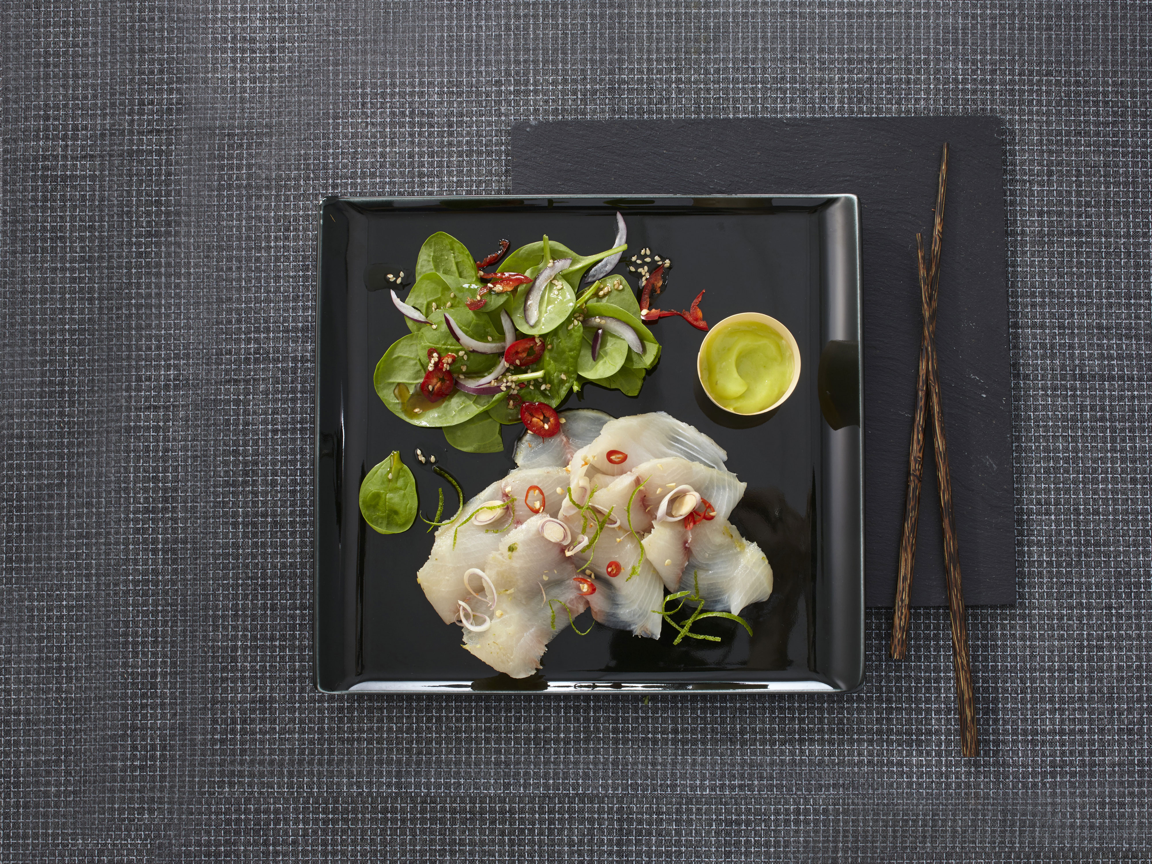 Gelbschwanzmakrele aus der Beize nehmen und mit einer Zange die Stehgräten ziehen. Das Filet auf der Haut in dünne Scheiben schneiden und zum Beispiel mit Wasabi-Mayonnaise und Spinatsalat servieren.
