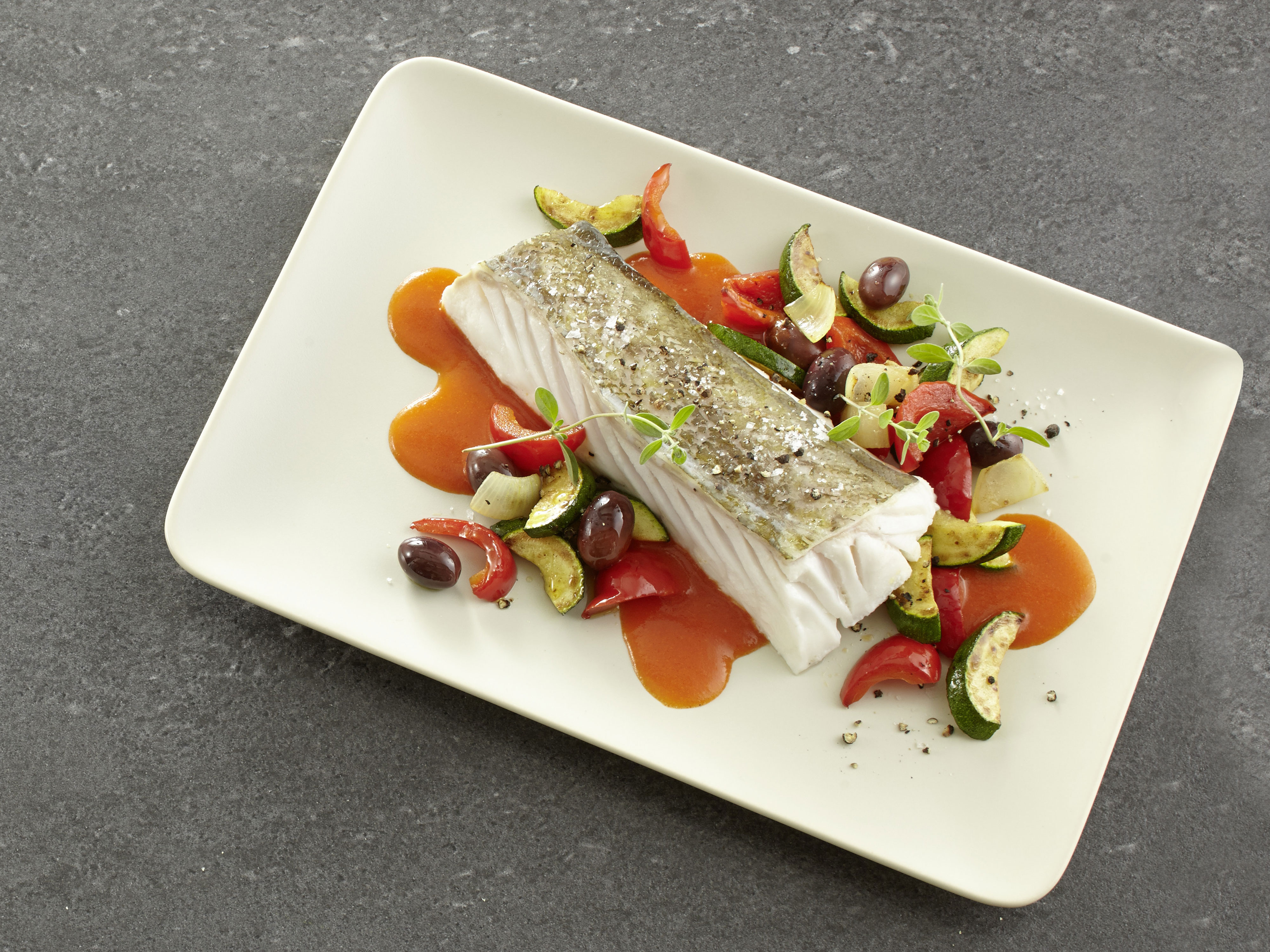 Der nordische Fisch versteht sich auf dem Teller bestens mit mediterranen Begleitern wie Zucchini, Oliven, Paprika, Knoblauch und Balsamico.