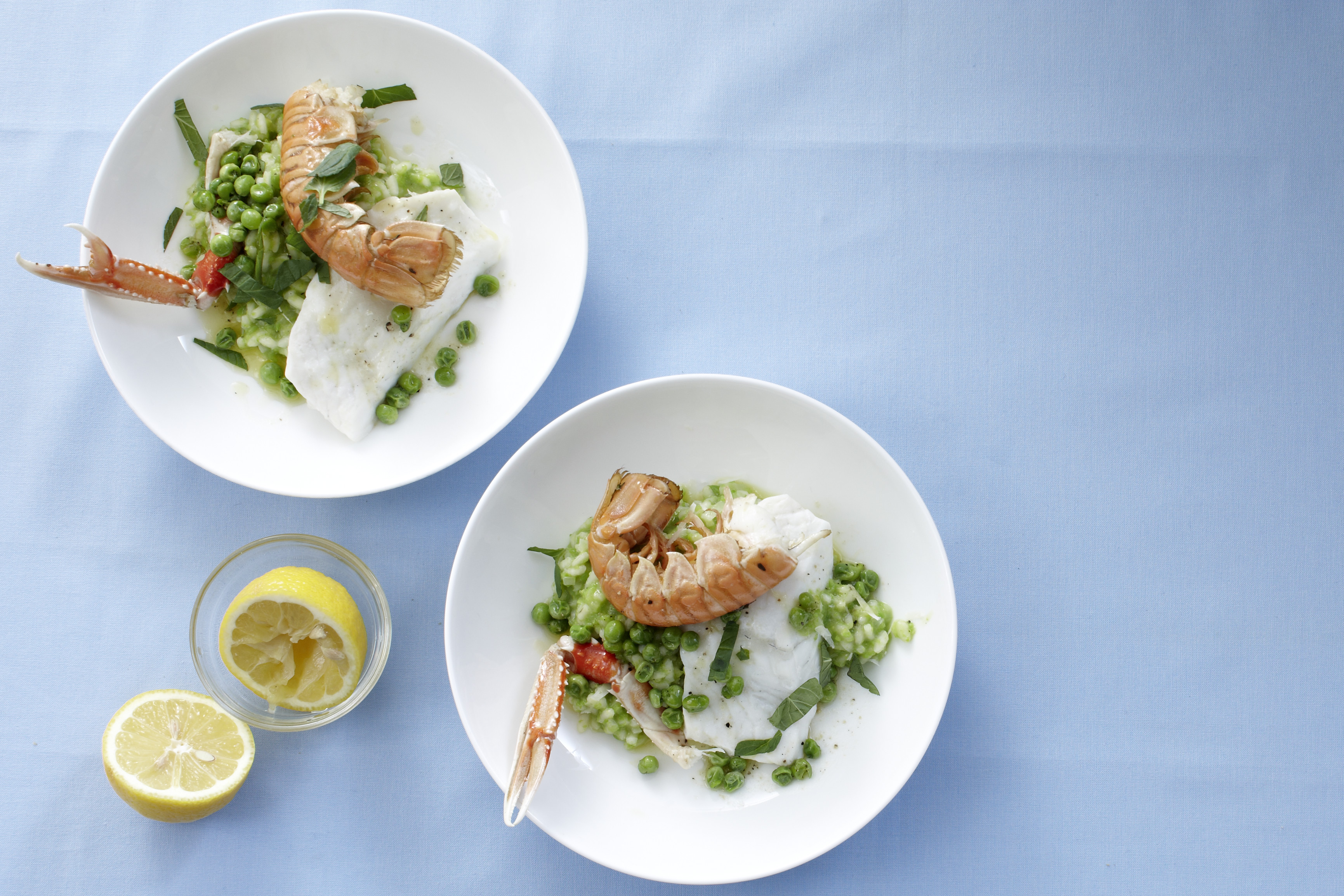 Ein pannensicheres Einsteiger-Risotto: das Erbsenpüree macht es automatisch cremig und durch die edle Fischauflage sieht es total gekonnt aus.