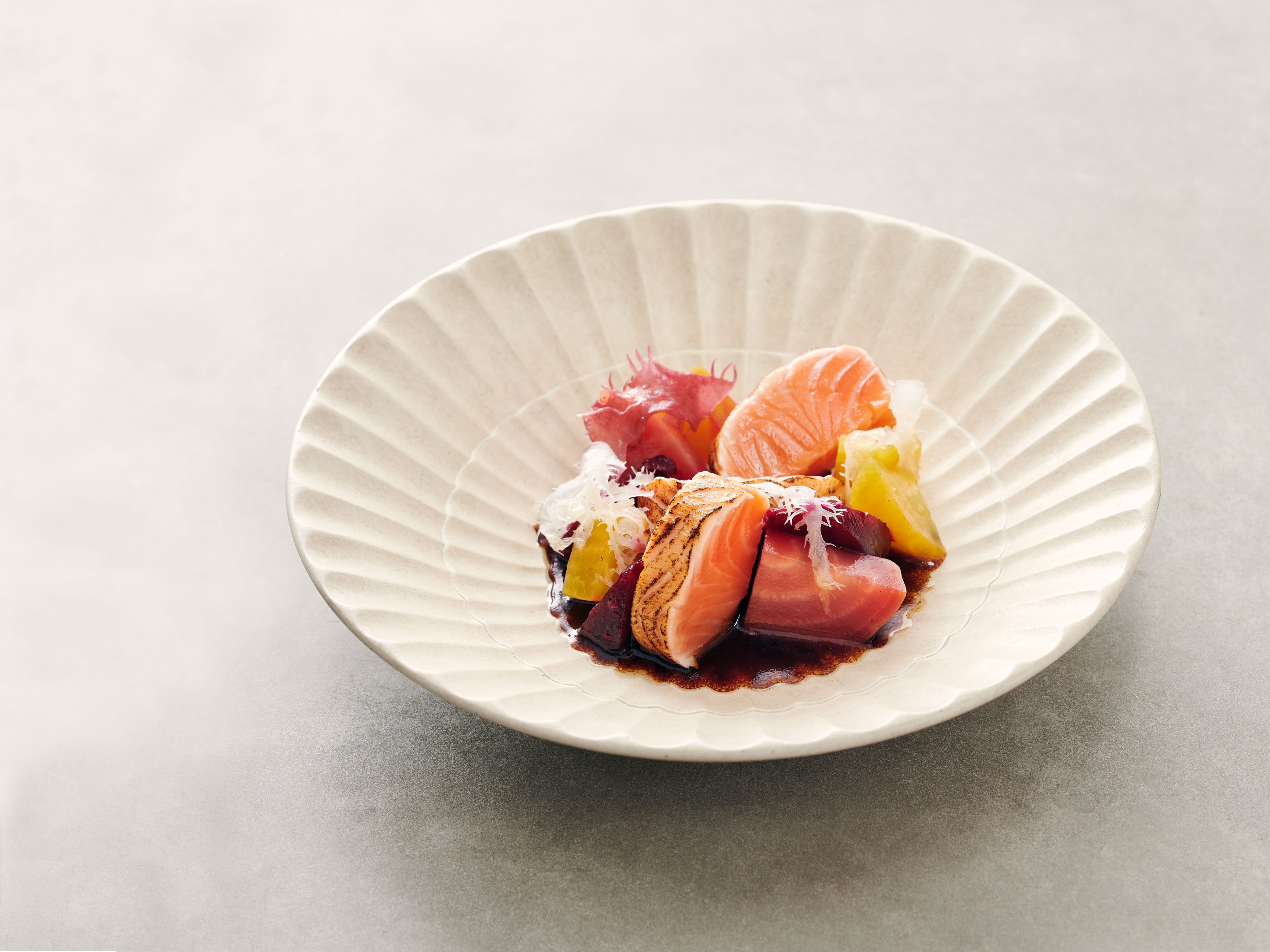 Nur kurz mit dem Bunsenbrenner abgeflämmt und auf Nussbutter mit asiatischem Touch serviert, kommt der pure Geschmack des Sashimi-Lachses besonders gut zur Geltung.