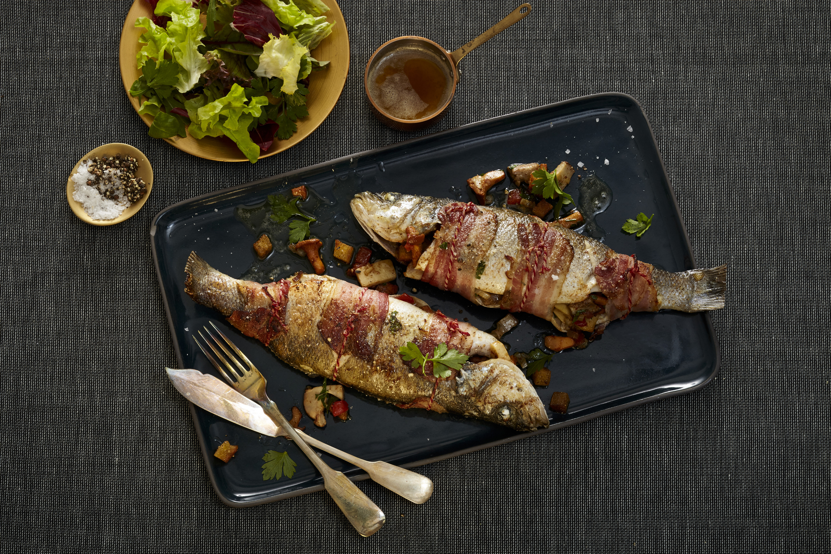 Wolfsbarsch von innen und außen mit Salz und Pfeffer würzen. Die Pilzmischung in die Fische geben, mit Speck umwickeln und mit Küchengarn fixieren. Fische in Olivenöl und Butter von beiden Seiten anbraten und dann im vorgeheizten Ofen bei 180° C für etwa 15 Minuten garen. Wolfsbarsch mit brauner Butter und gemischtem Salat servieren.