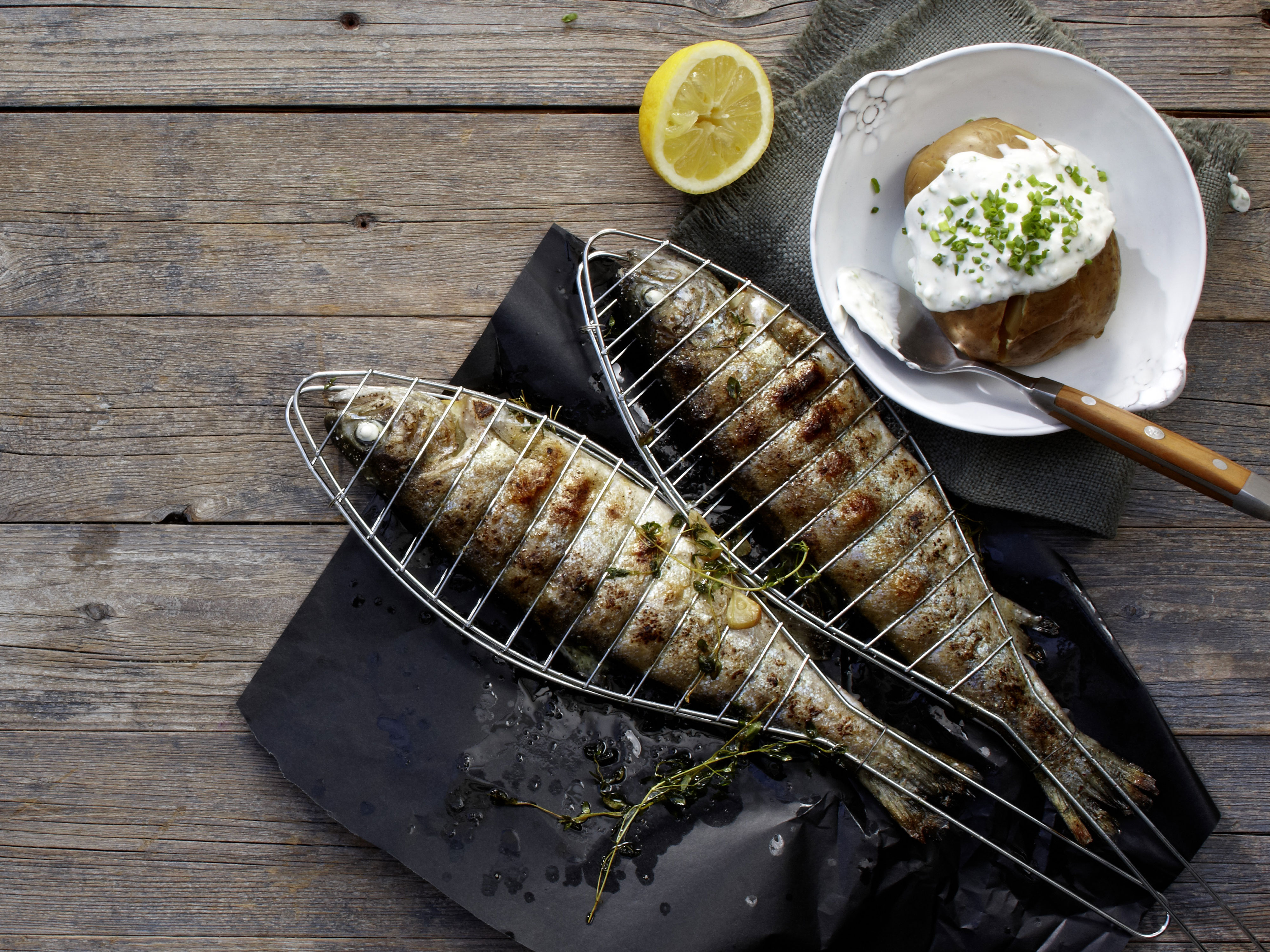 Kartoffeln aus der Glut nehmen, längs aufschneiden und mit Salz würzen. Mit dem Quark füllen, mit Olivenöl beträufeln und mit Schnittlauchröllchen bestreuen. Zu den Forellen servieren.