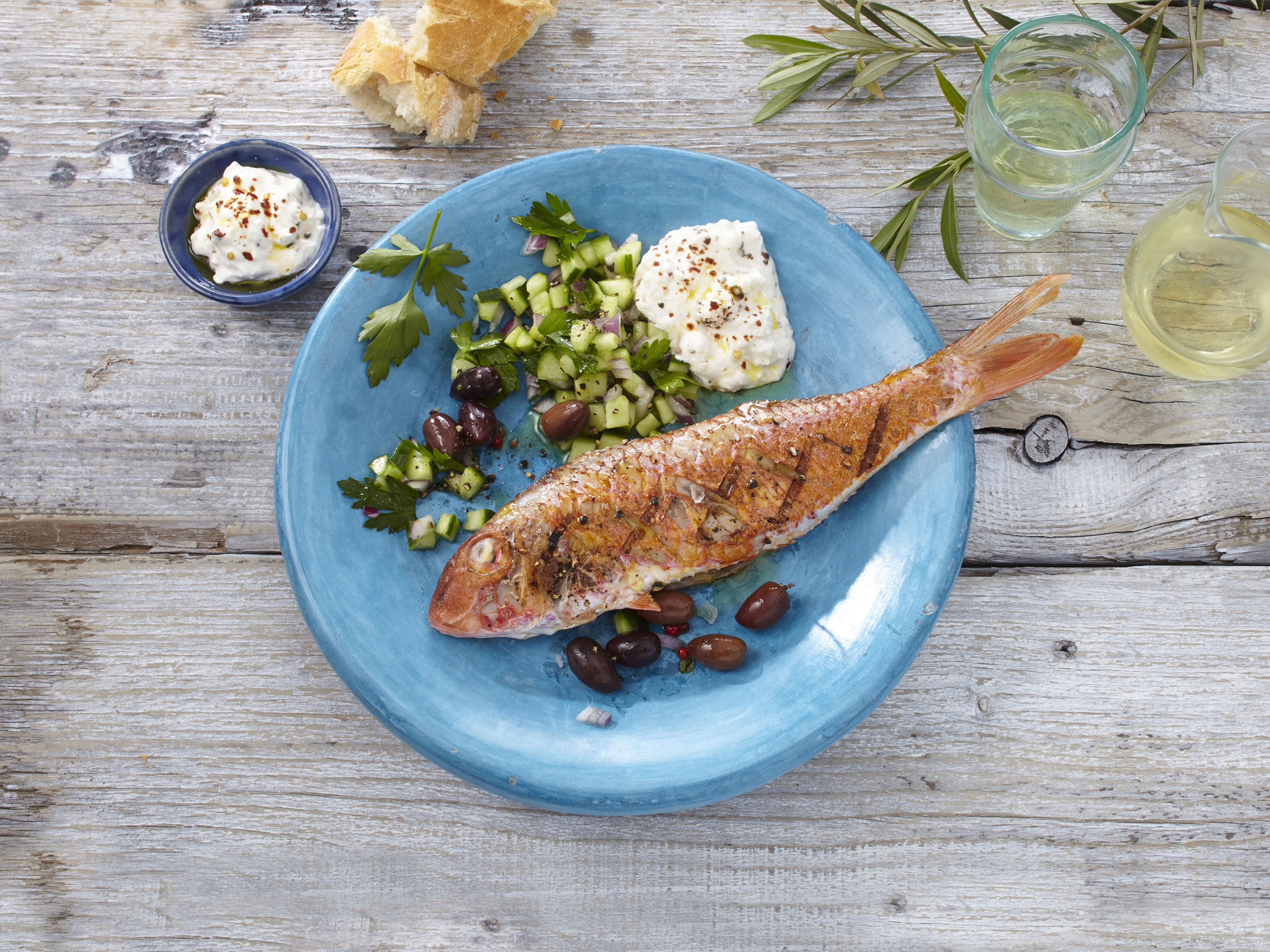 Die Haut der Meerbarben mit einem scharfen Messer einschneiden und von innen und außen mit Salz und Pfeffer würzen. Meerbarben dünn mit Olivenöl einstreichen, auf den heißen Grill legen und nach 2-3 Minuten wenden. Fische nach 3 weiteren Minuten wenden und, je nach Größe, am Rande des Grills für 3-5 Minuten fertig garen. Wenn die Rückenflosse leicht gezogen werden kann, ist der Fisch gar. Meerbarbe mit Gurkensalat, Feta-Joghurt und Oliven servieren. Dazu passt Fladenbrot.