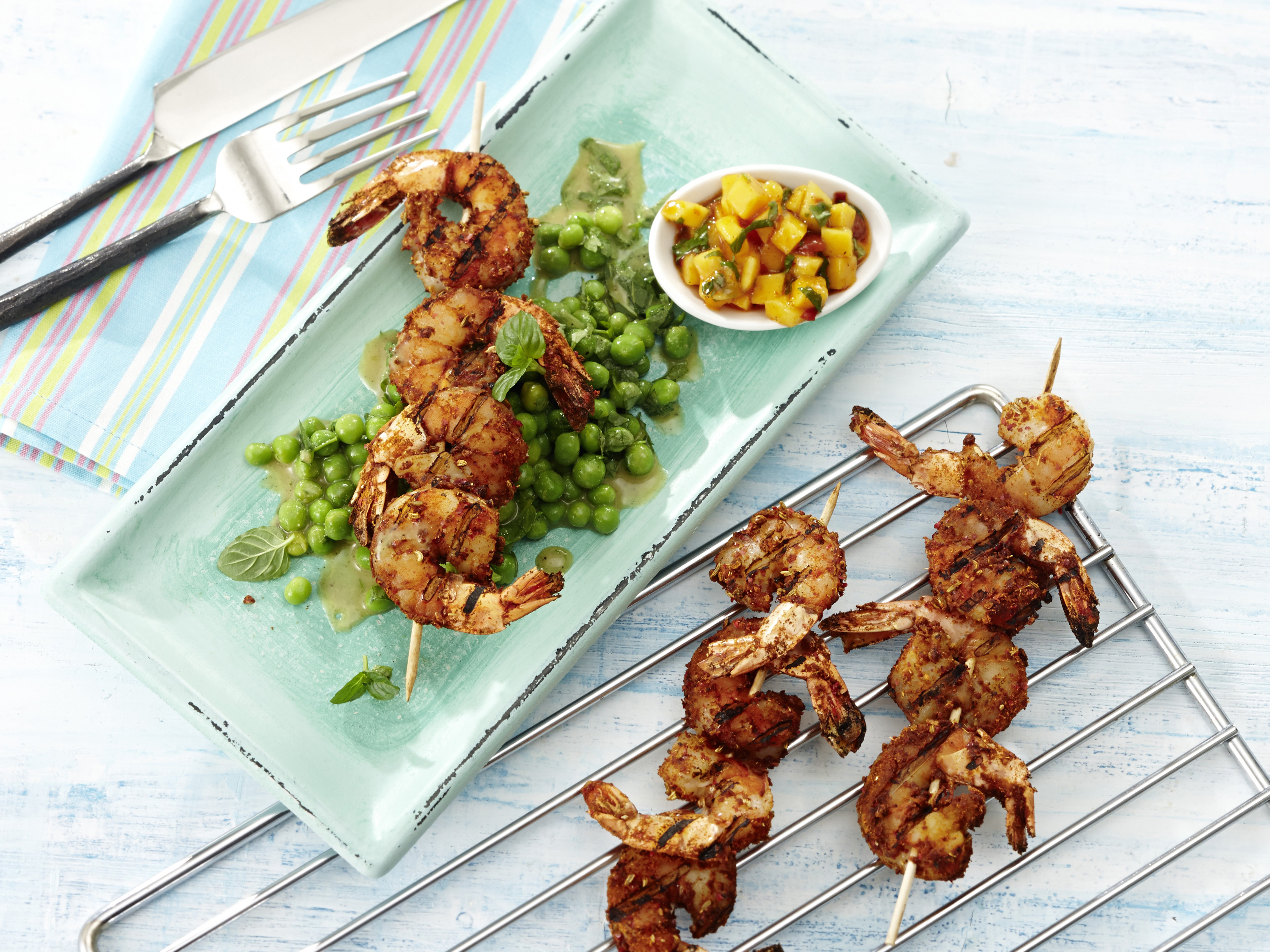 Garnelenspieße auf dem heißen Rost ca. 1 Minute von jeder Seite schön knusprig grillen. Erbsensalat auf Tellern anrichten und die Spieße dazulegen.