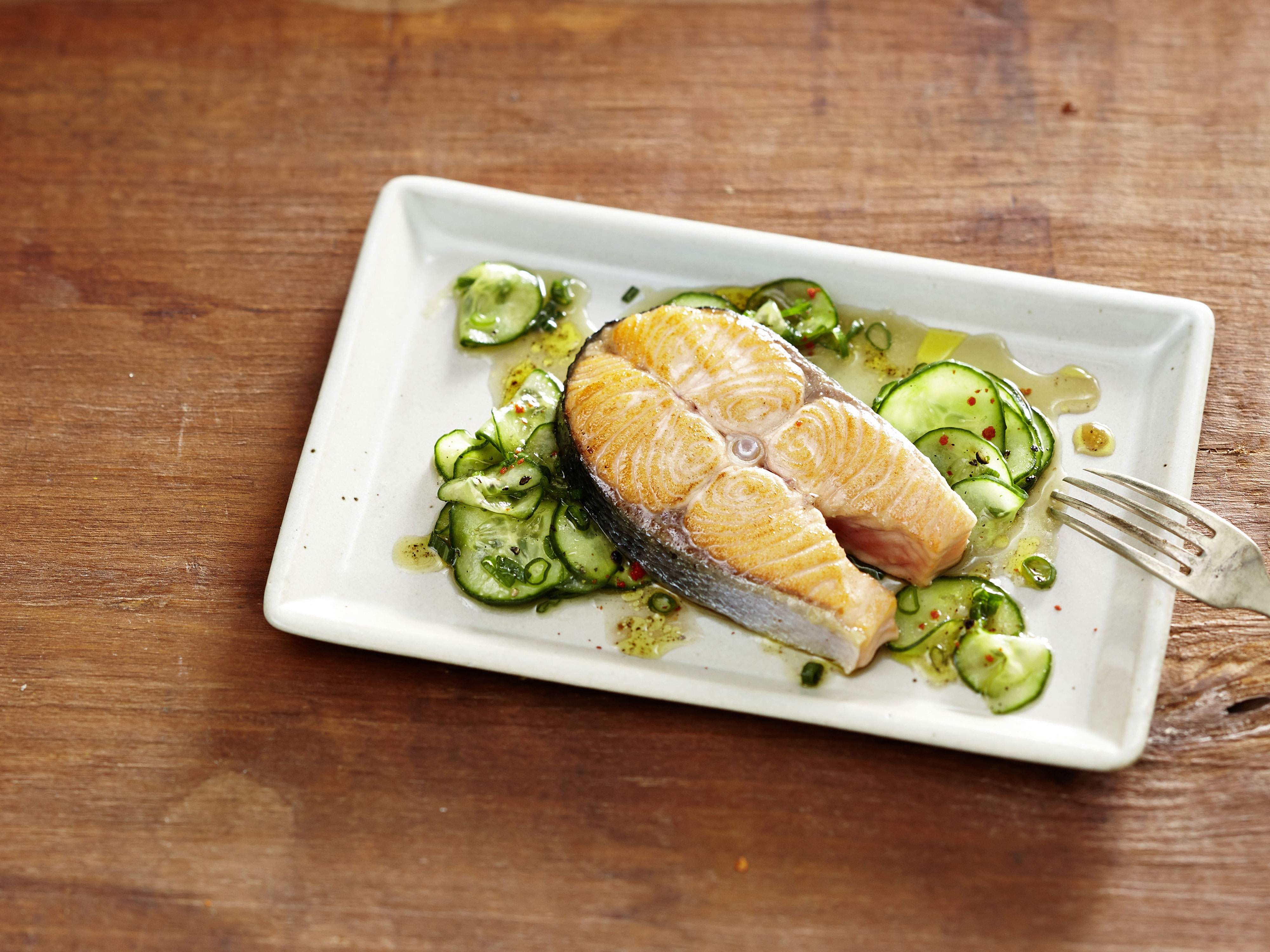 Lachssteak vom Grill: saftig, pur, unkompliziert. Der feurig-asiatische Gurkensalat mit Sojasauce und Sesamöl rundet das Sommergericht wunderbar ab.
