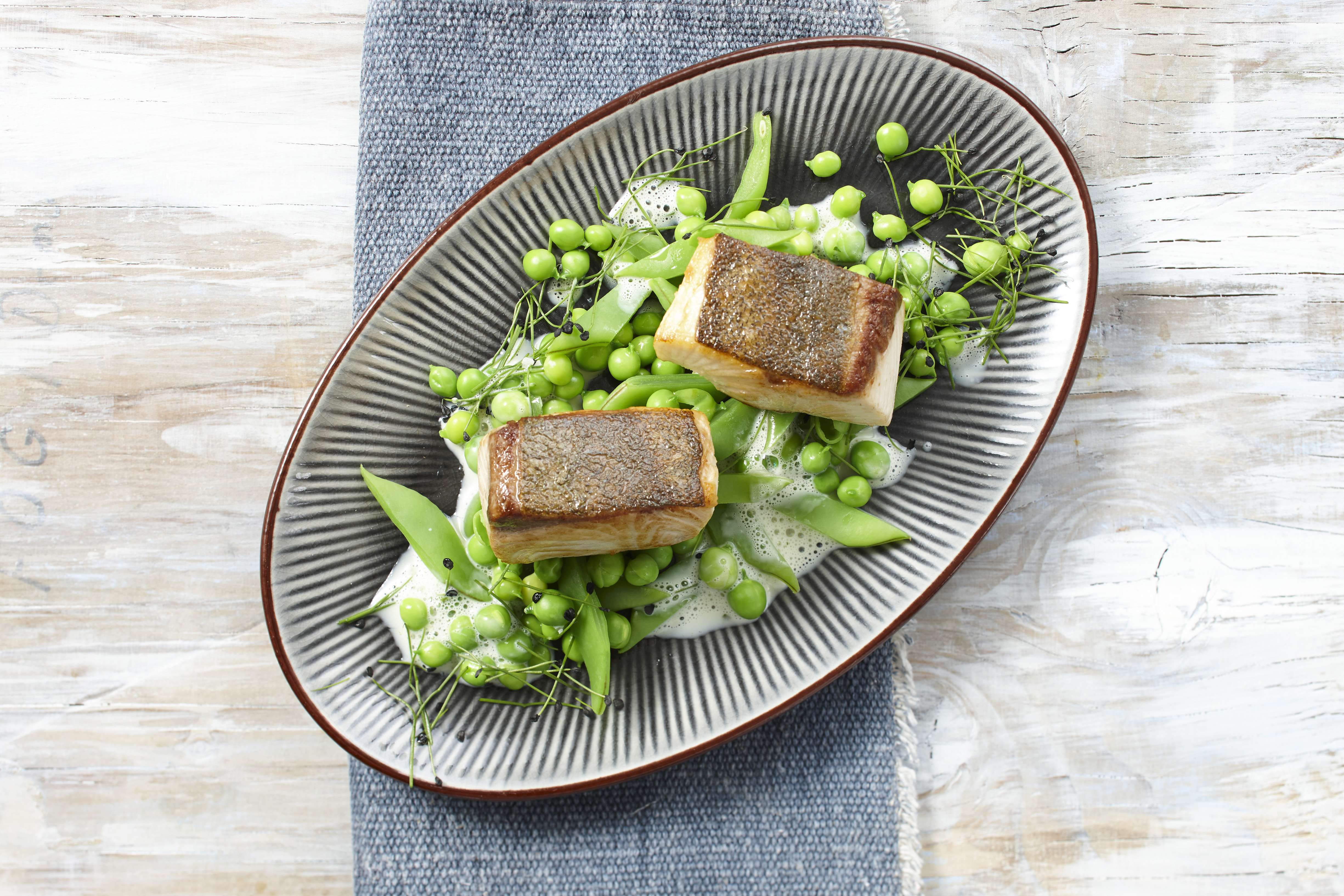 Für die Gelbschwanzmakrele eine Pfanne heiß werden lassen und Öl hinzugeben. Fisch trocken tupfen und bei mittlerer Hitze zunächst auf der Hautseite braten. Gelbschwanzmakrele nach 6 Minuten umdrehen, auf der Fleischseite weitere 4 Minuten braten und mit Salz und Pfeffer würzen. Erbsengemüse in der restlichen Butter anschwitzen und ebenfalls mit Salz und Pfeffer abschmecken. Erbsengemüse und Fisch anrichten, mit Sauce beträufeln und mit Zwiebelsprossen garnieren.