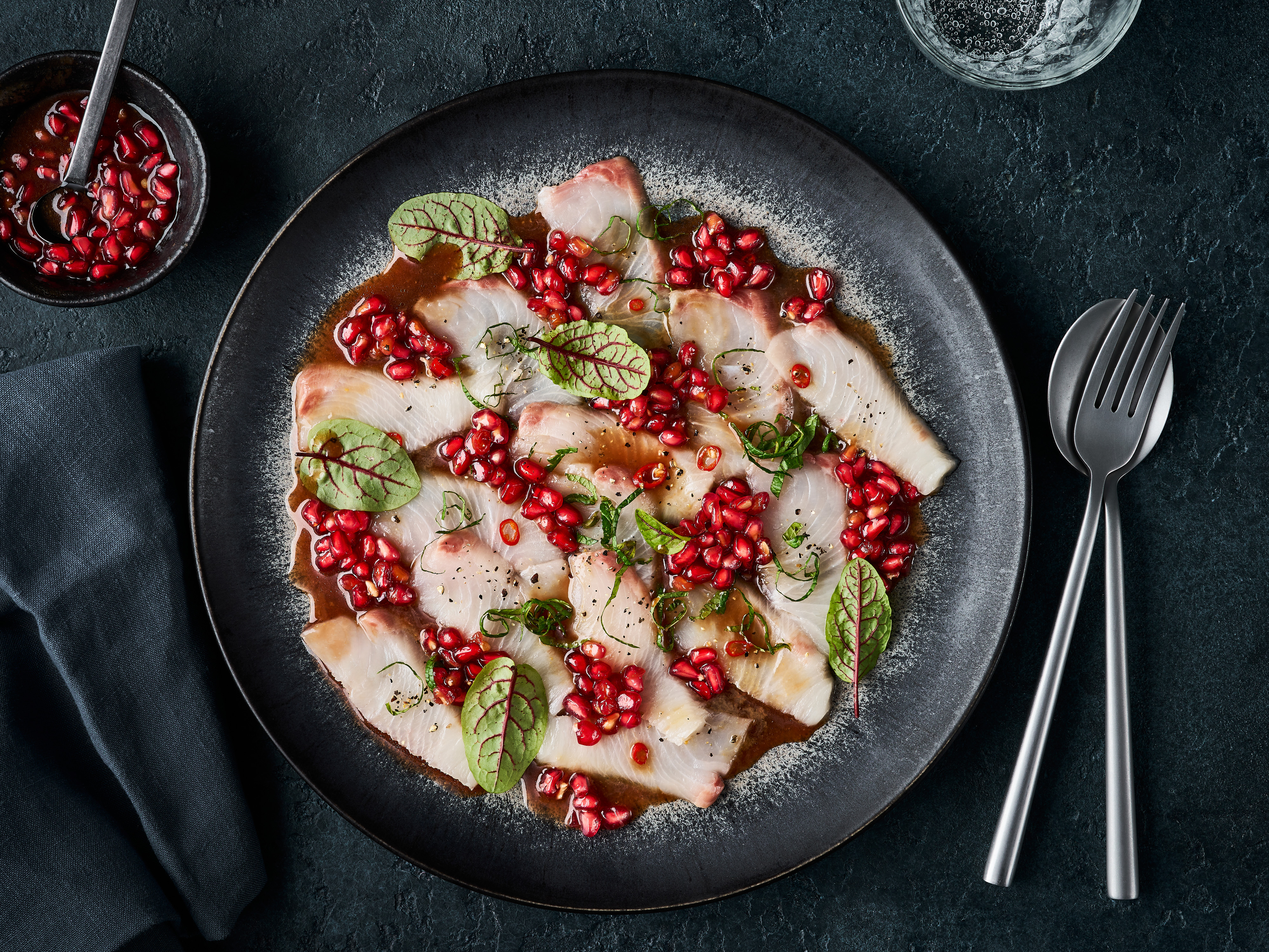 Alles mit den Granatapfelkernen und der Marinade beträufeln. Minze und einige Blätter Blutampfer über dem Crudo verteilen.