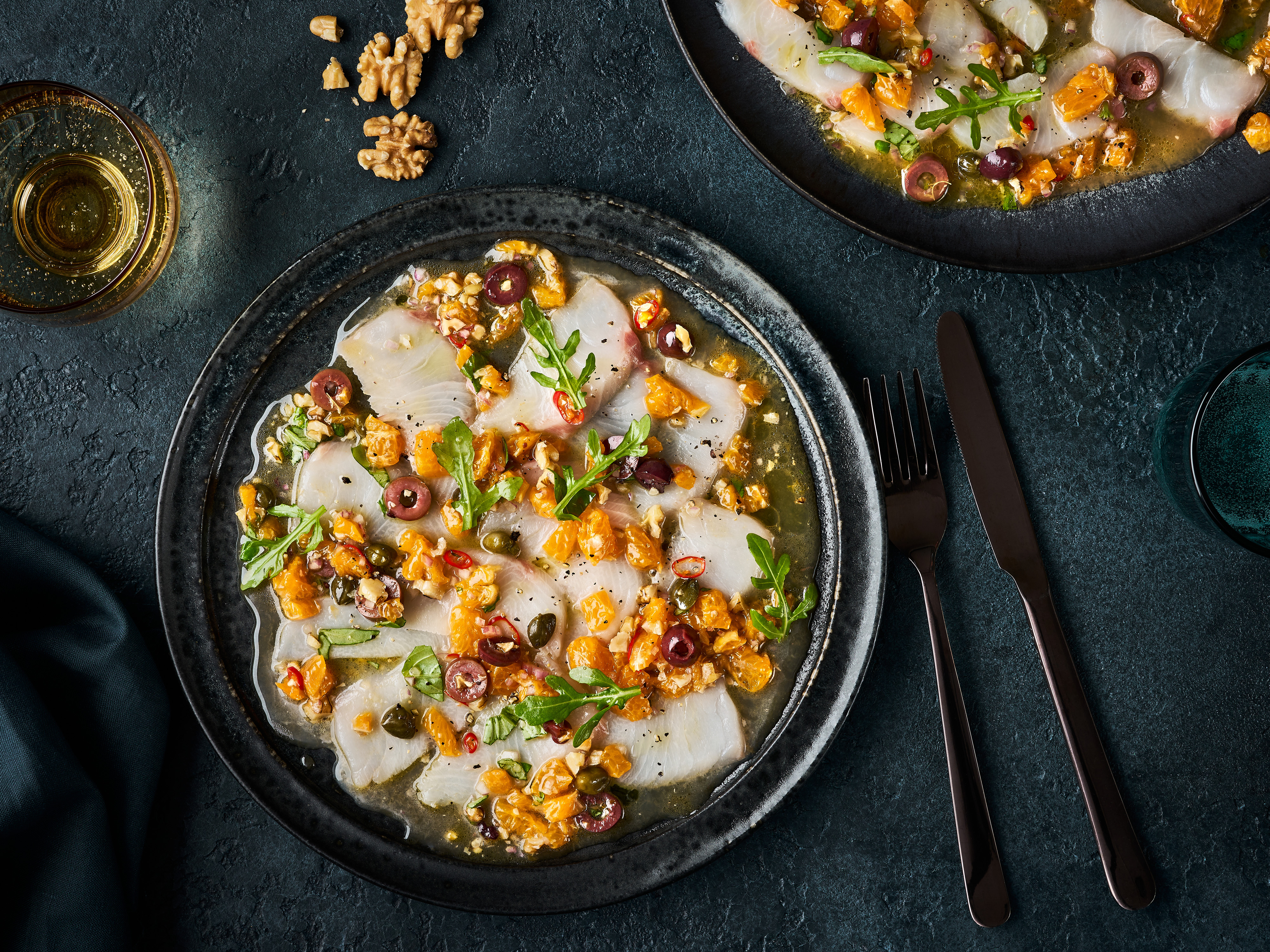 Alles mit der Marinade beträufeln und die Walnüsse darüber streuen. Crudo mit Rucola garnieren und mit grobem Pfeffer bestreuen.