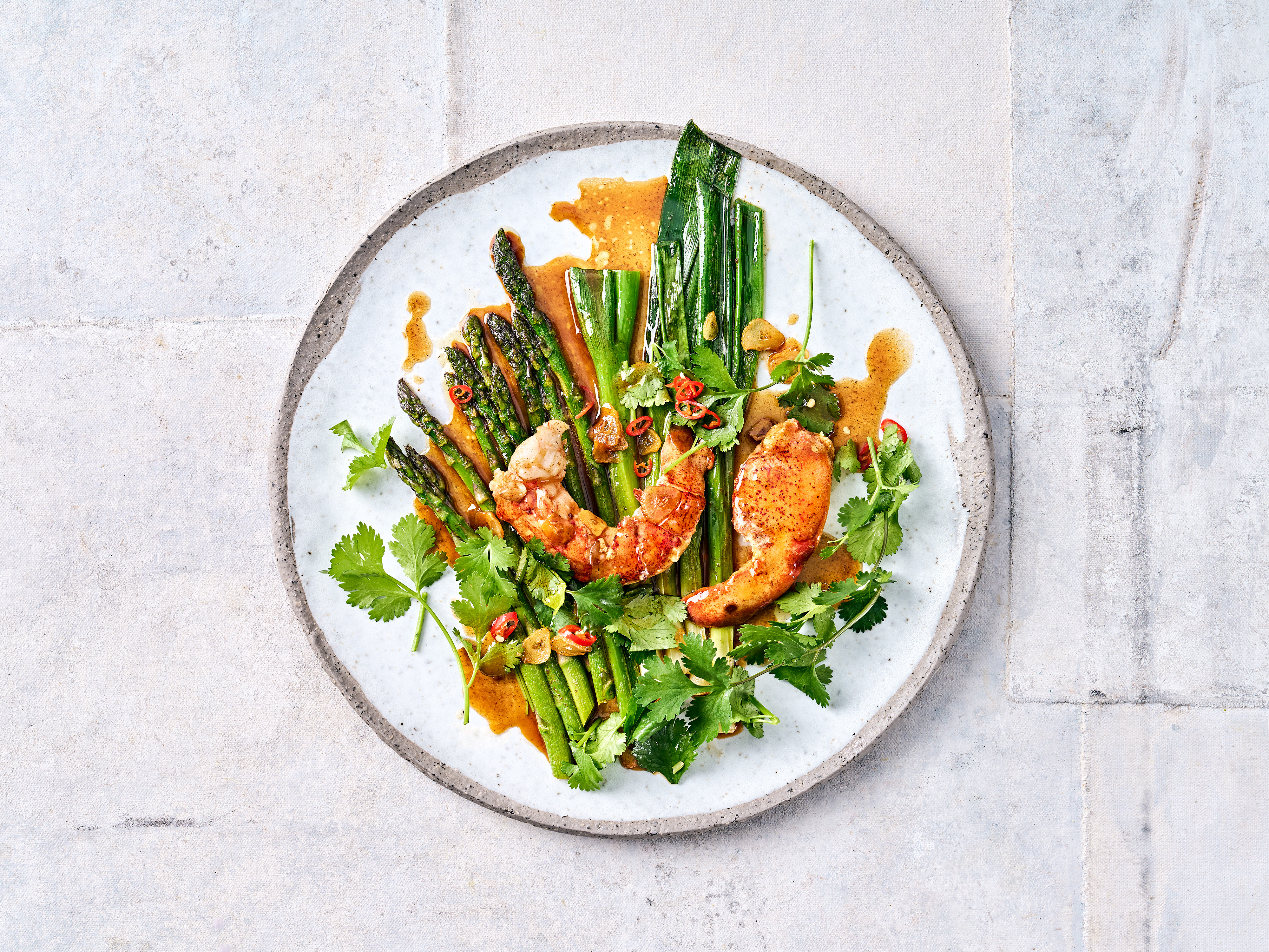 Der König der Krustentiere glänzt mit Sojasauce glasiert auf Spargel, Frühlingszwiebeln und Koriander.
