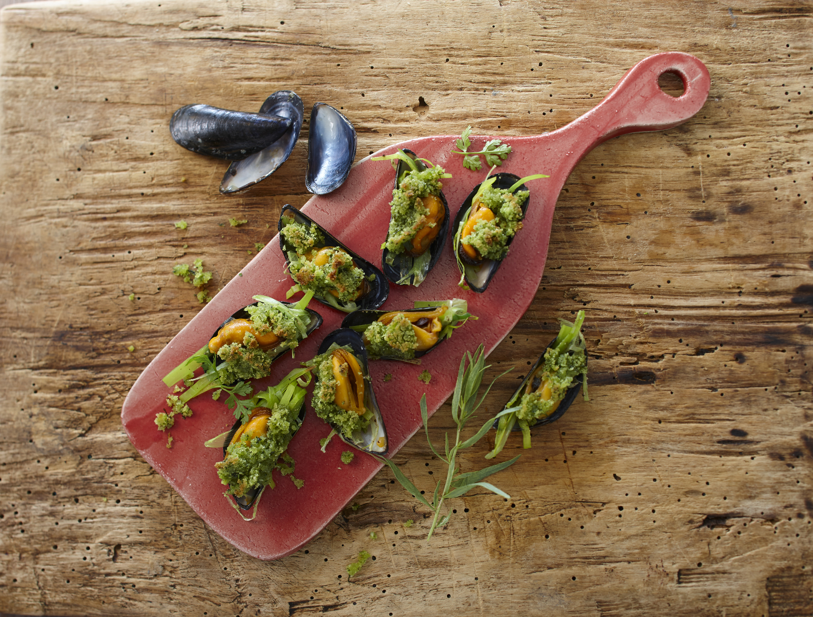 Nordsee küsst Mittelmeer: Miesmuscheln auf blanchierten Lauchstreifen, gratiniert mit Kräuterbröseln aus Estragon und Kerbel.