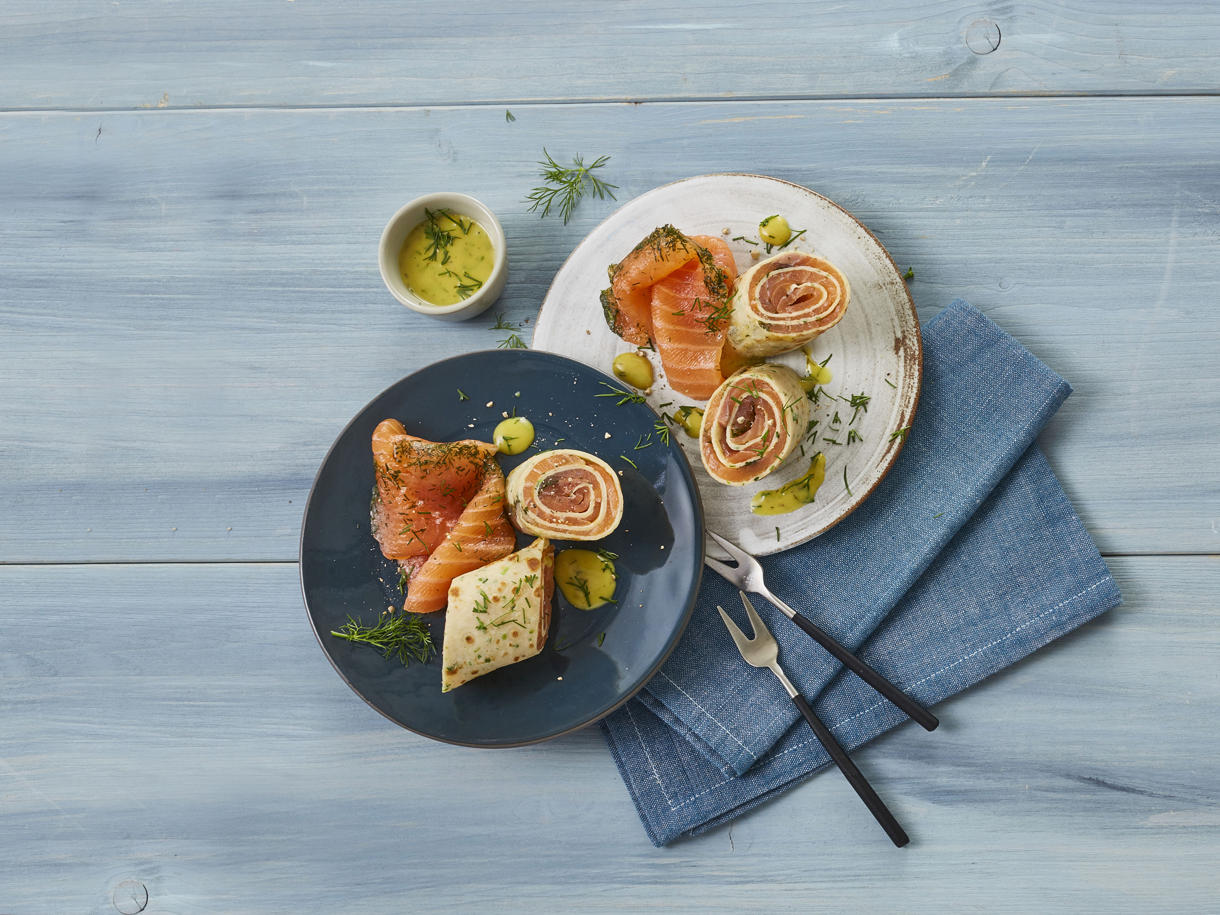 Herzhaft statt süß – Kräutercrêpes mit Graved Lachs und Senf-Dillsauce stellen den süßen Pfannenkuchen in den Schatten.