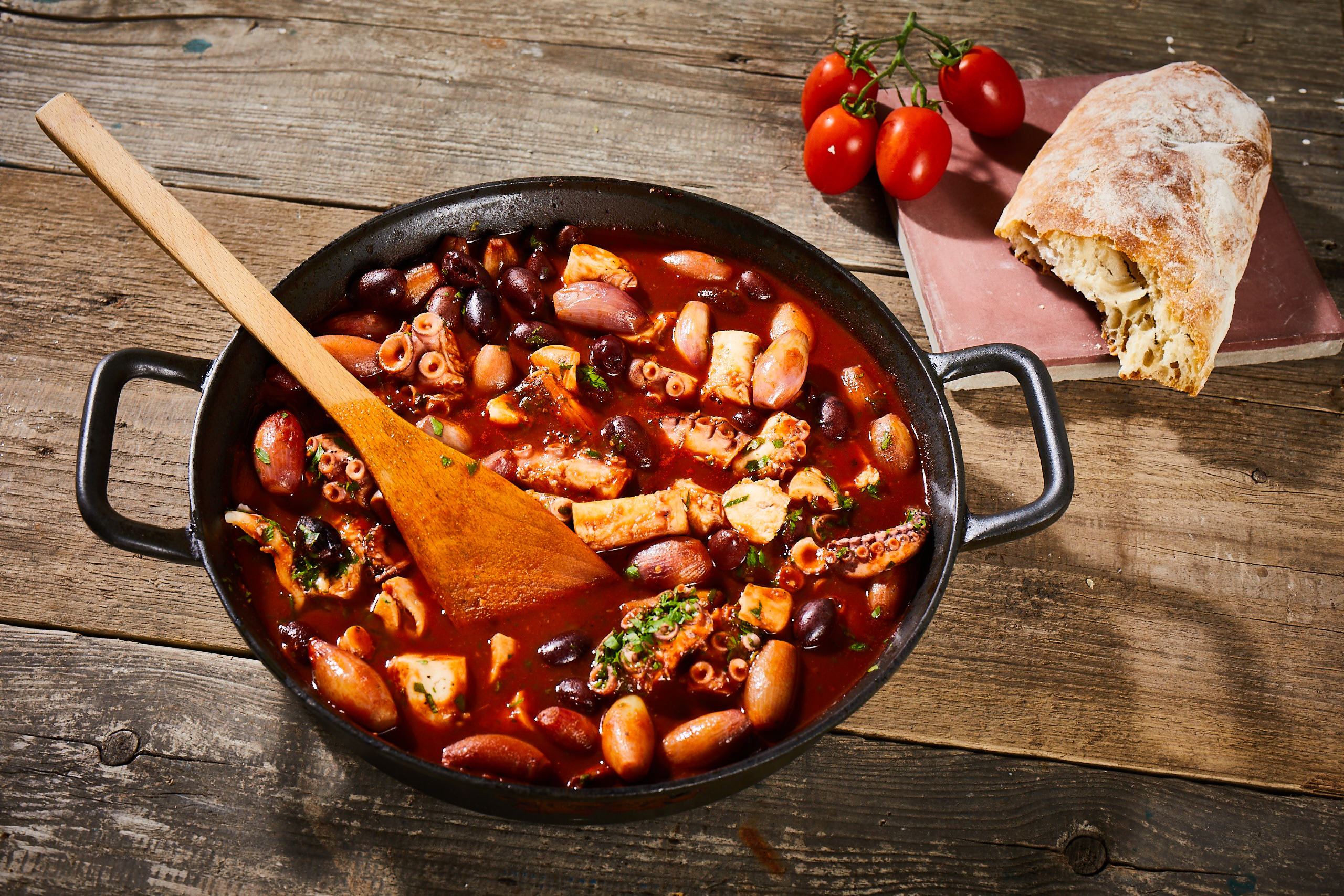 Pulpo in mundgerechte Stücke schneiden, Petersilie grob hacken und zusammen mit den Oliven in den Eintopf geben. Alles aufkochen und mit Salz und Pfeffer abschmecken. Dazu passen zum Beispiel Kitharaki (Griechische Nudelsorte).