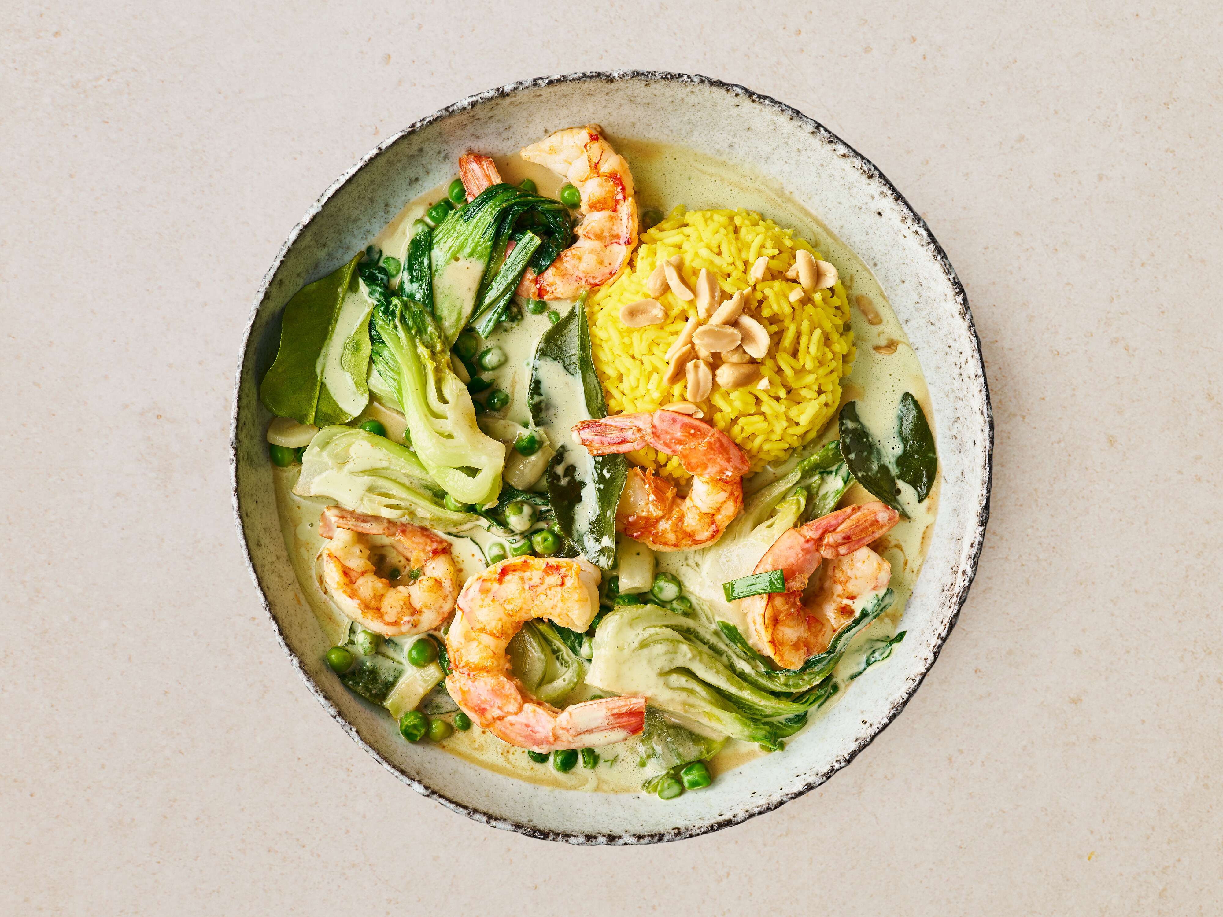 Die nussigen, leicht süßlichen Rotgarnelen ergänzen das scharfe Curry mit Pak Choi, Erbsen und Frühlingslauch perfekt.