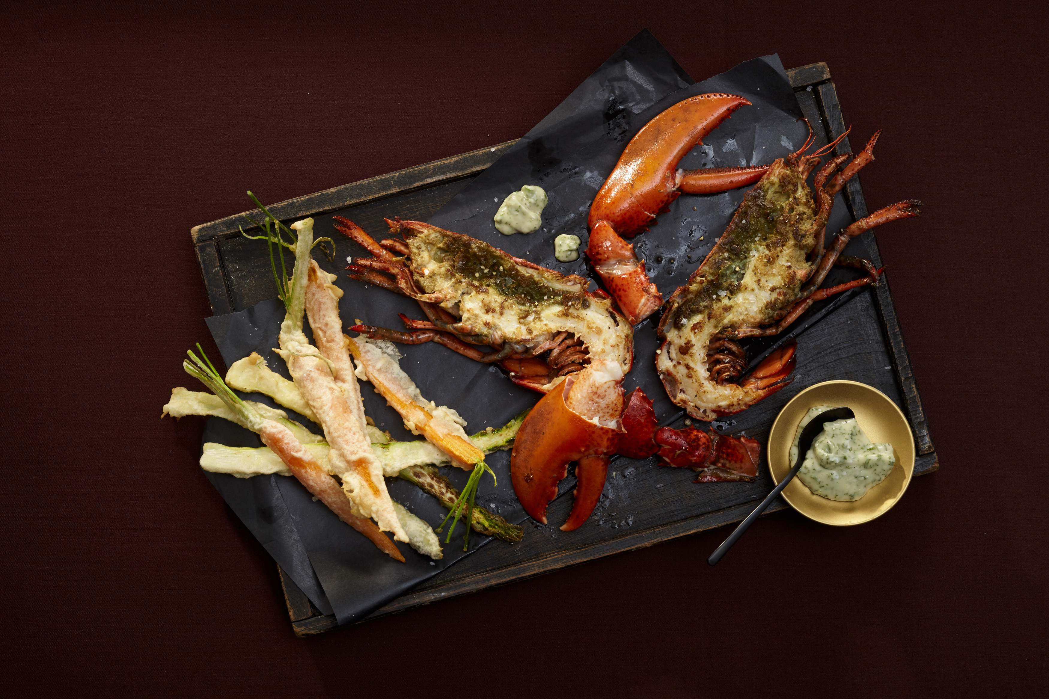 In zwei großen Pfannen jeweils 2 Esslöffel Olivenöl erhitzen. In einer Pfanne die Hummerhälften auf der Fleischseite anbraten. In der anderen Pfanne die Scheren anbraten. Nach 4-6 Minuten die Butter auf die Pfannen verteilen, für 2 Minuten weiter braten und wenden. Hummer weitere 4-6 Minuten braten und dabei mehrmals mit dem heißen Fett übergießen. Hummer mit Tempuragemüse und Kräuter-Knoblauchmayonnaise servieren.