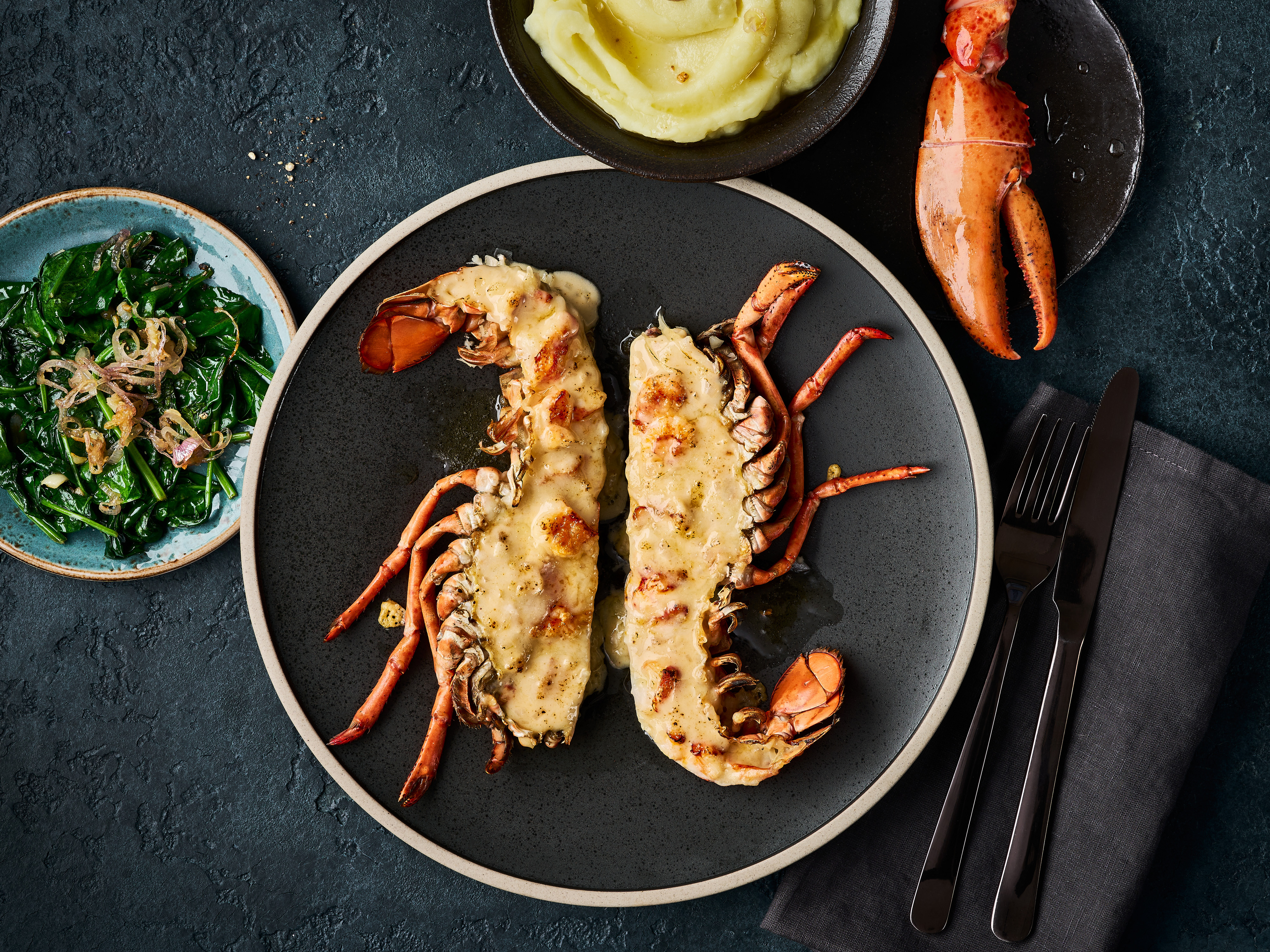 - 6 Restliche Butter in einem Topf erhitzen und die Schalottenringe und restlichen Knoblauch darin kurz anbraten. Mit Salz und Muskat würzen und den Spinat untermengen und zusammenfallen lassen. Gratinierten Hummer mit den warmen gekochten Hummerscheren und dem Spinat servieren.