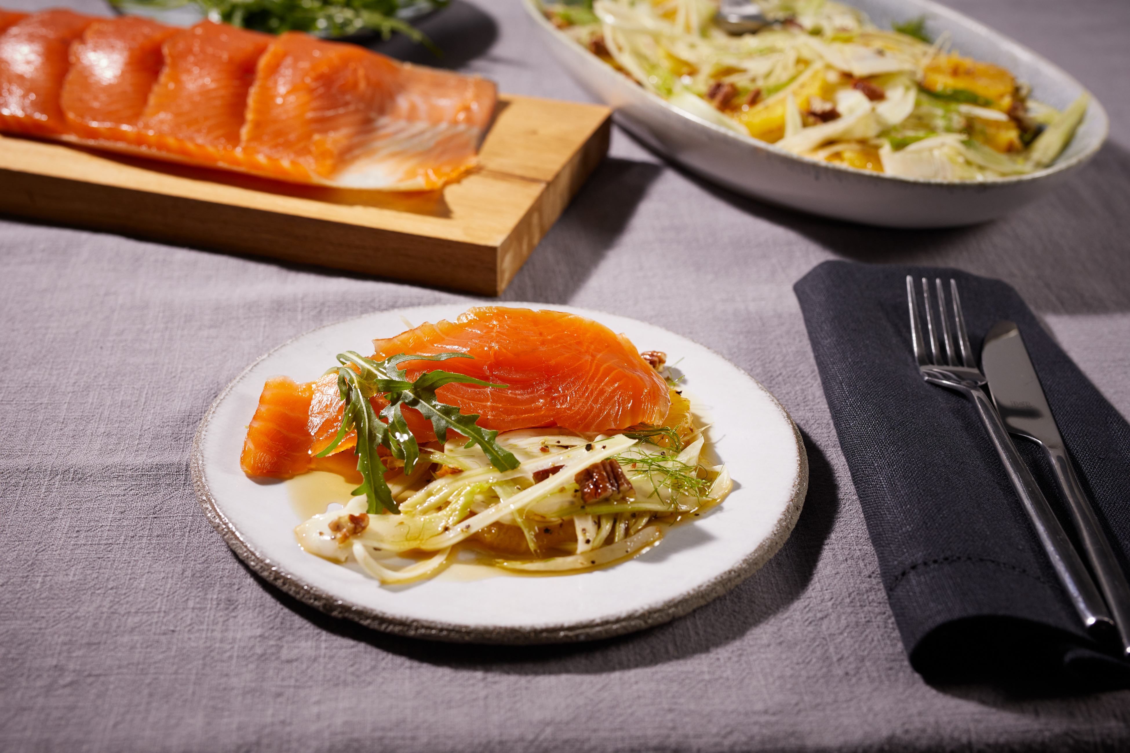 Indianer mit Fenchel-Orangensalat und Ahornsirup servieren. Die Lachssegmente von der Haut schneiden und auf die Teller mit dem Salat verteilen. Räucherlachs mit Ahornsirup beträufeln und Rucola bestreuen.