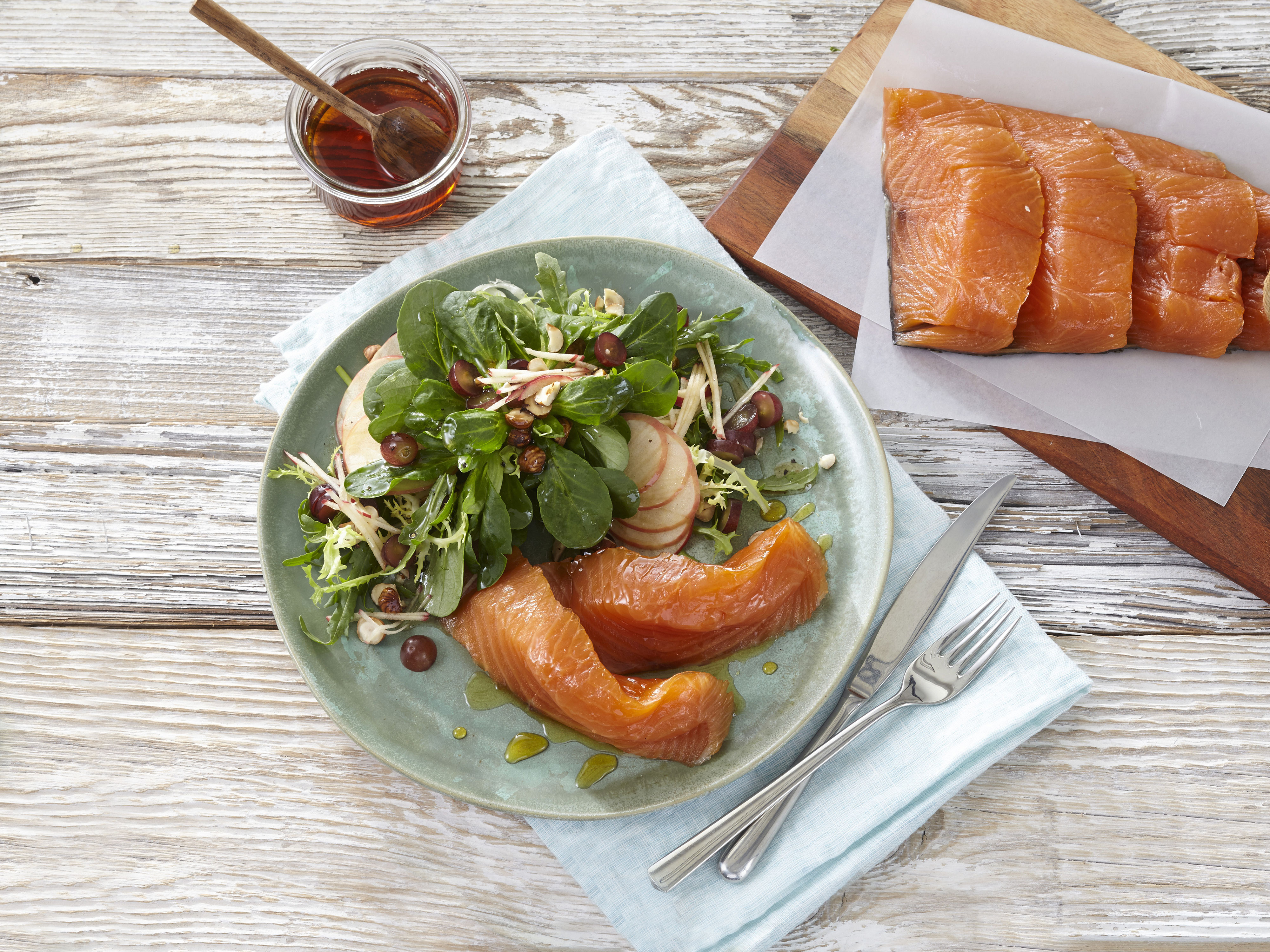 Ein Dressing aus dem Haselnussöl, Himbeeressig, Honig, Salz und Pfeffer machen. Salat salzen, pfeffern und mit dem Dressing anmachen. Trauben, Nüsse und Apfel darüber geben und den Salat auf 4 Teller verteilen. Vom Räucherlachs Tranchen schneiden und um die Salate verteilen. Räucherlachs mit Ahornsirup beträufeln und dazu anbieten.