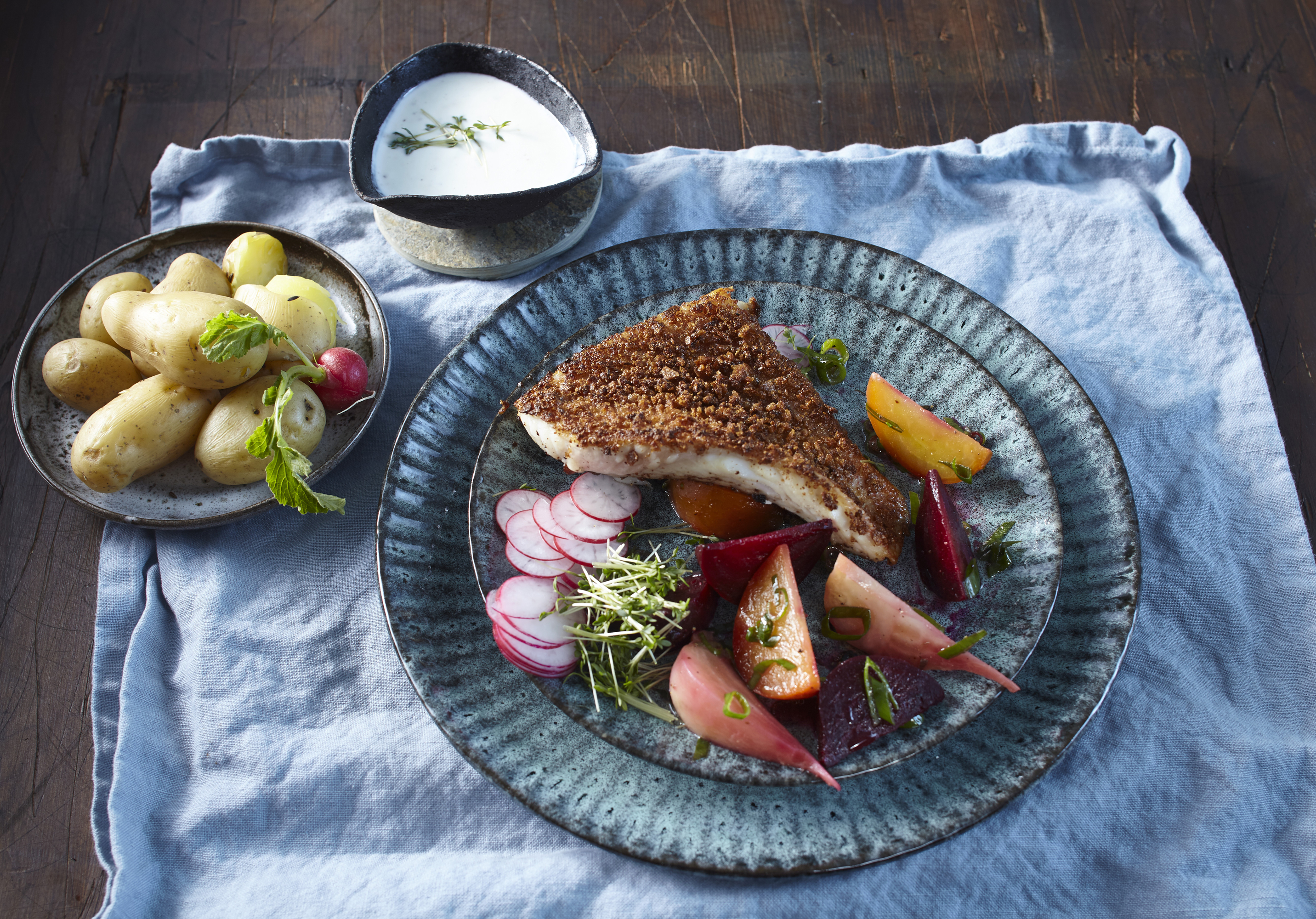 Rotbarschfilets mit Salz und Pfeffer würzen. Knäckebrot in einen Beutel geben und zu feinen Bröseln zerkleinern. Die Filets mit der Hautseite in die Brösel legen und leicht andrücken. Rotbarsch auf der Hautseite bei mittlerer Hitze in 2 Esslöffeln Öl und 2 Esslöffeln Butter für 4-5 Minuten braten. Filets wenden und weitere 3-4 Minuten braten. Rotbarschfilets mit Bete-Spalten, Kümmel-Kartoffeln, Radieschen und Dickmilch servieren und mit Kresse garnieren.
